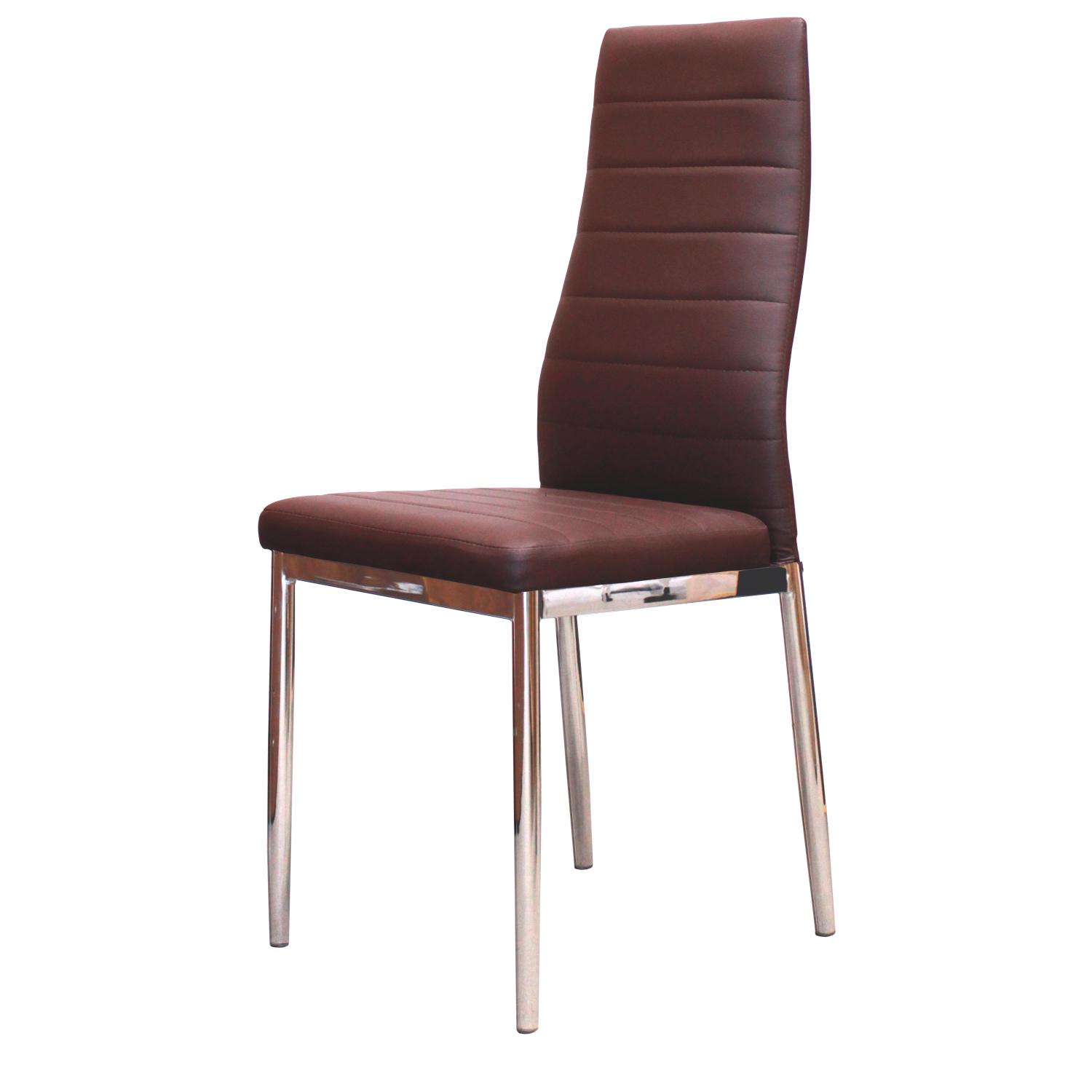 Jedálenská stolička MILÁNO s hnedým poťahom z imitácie kože má kovové pochrómované nohy. Výška sedu stoličky je 46 cm. Jedálenská stolička MILÁNO bude vyzerať skvele pri stole so sklenenou doskou. Stolička MILÁNO má vysokú prehnutú opierku, takže sa vám na nej bude pohodlne sedieť.