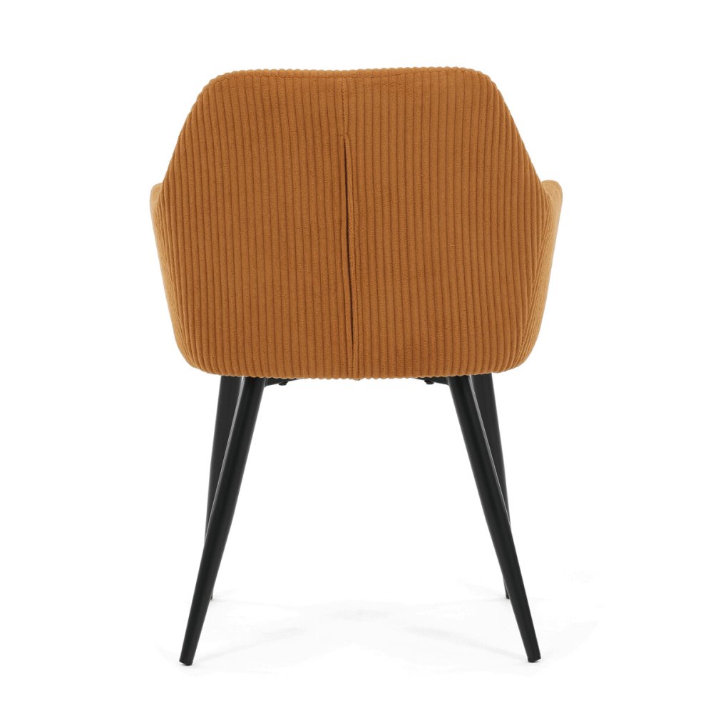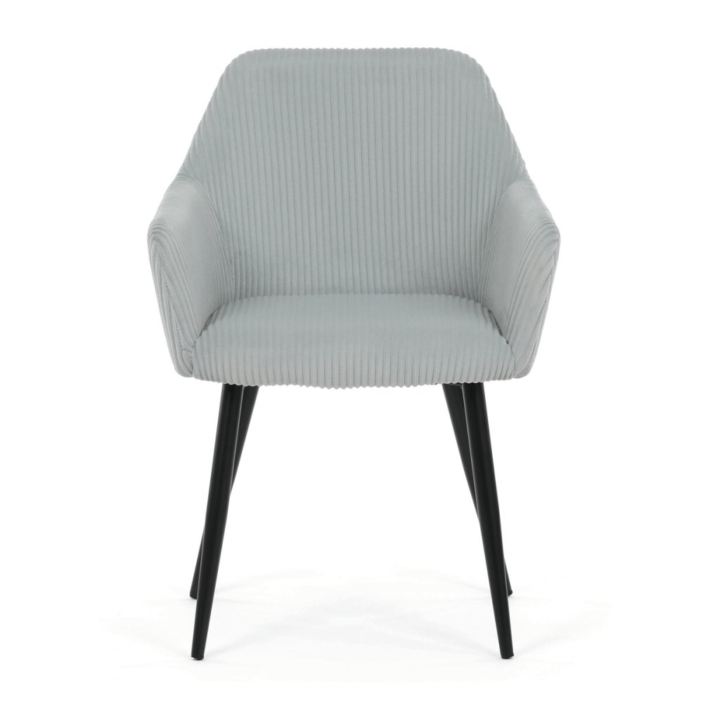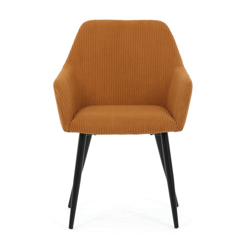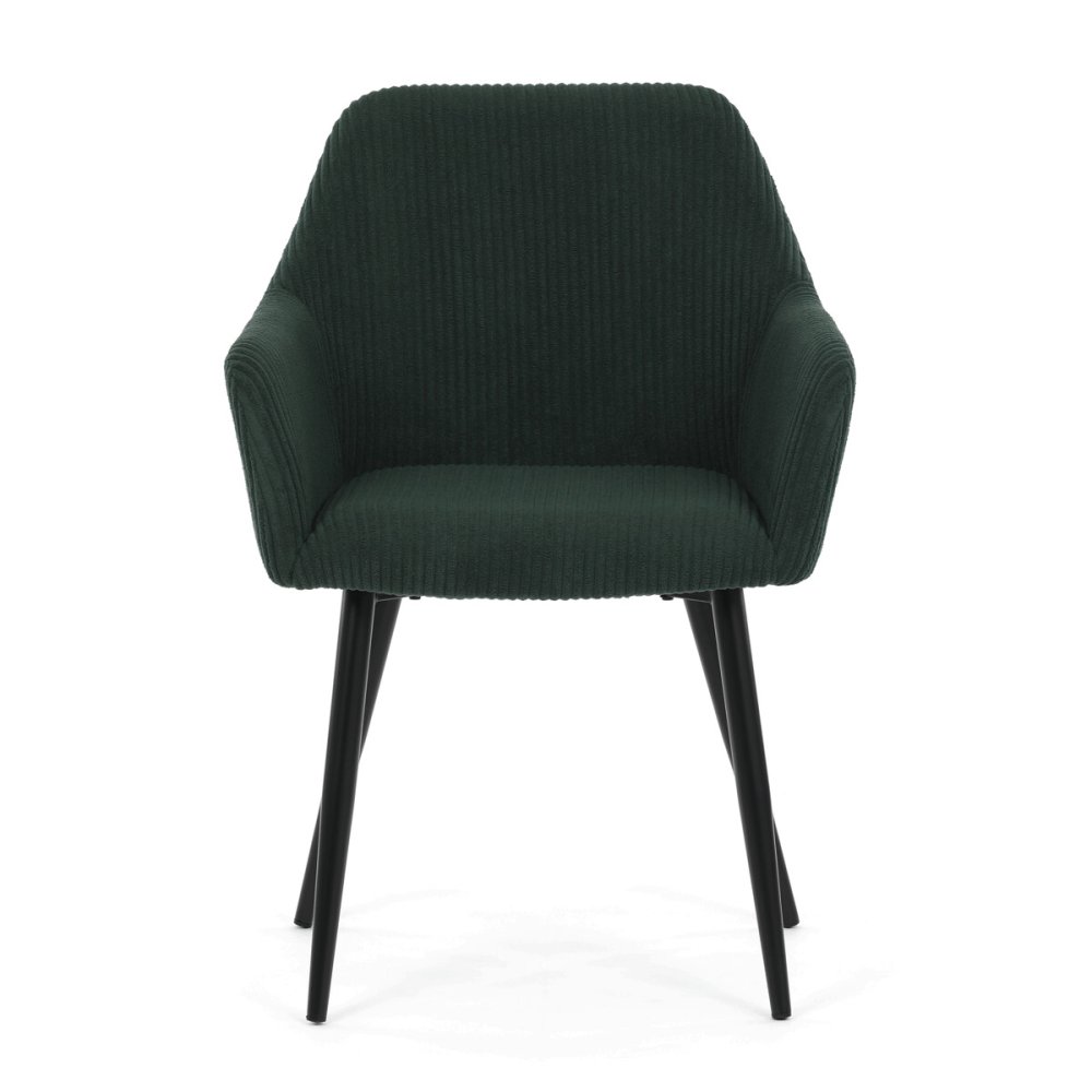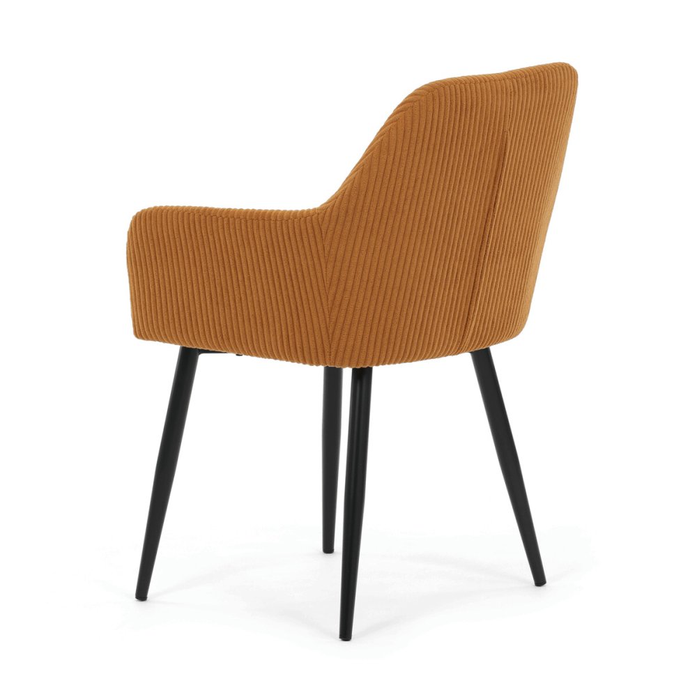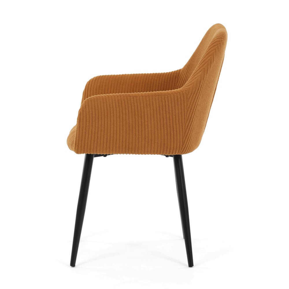 Sedák aj operadlo sú vyplnené mäkkou penou, ktorá zaisťuje komfort aj pri dlhšom sedení. Stabilné kovové nohy v čiernom matnom prevedení dodávajú stoličke pevnosť a zároveň moderný vzhľad. Podrúčky sú ergonomicky tvarované a čalúnené rovnakým materiálom ako sedák, čo prispieva k celkovému pohodliu a estetike. Stolička je určená na bežné užívanie v jedálňach či kancelárskych priestoroch, kde oceníte kombináciu dizajnu a funkčnosti.