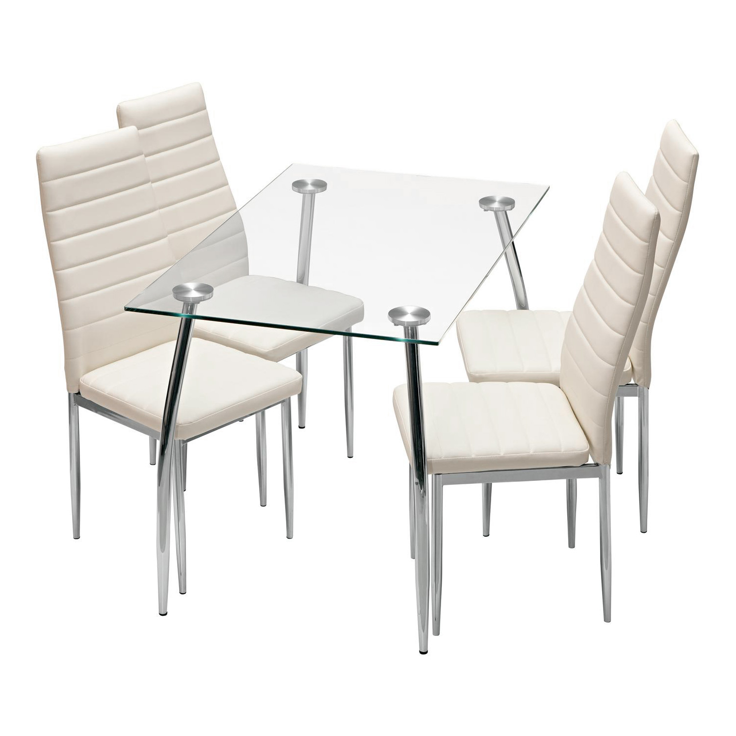Modernú jedáleň môžete mať na dosah vďaka jedálenskému stolu so sklenenou doskou a jedálenským stoličkám s poťahom z imitácie kože. Jedálenská súprava GRANADA 4401 je zložená z jedálenského stola GRANADA 3015 a štyroch jedálenských stoličiek MILÁNO 3009. Stôl v kombinácii kov / číre tvrdené sklo má pochrómované nohy a je v rozmere 110 × 70 × 74 cm. Stolička má poťah z imitácie kože vo farebnom prevedení krémovo biela a pochrómované nohy, výšku sedu 46 cm a rozmer 41 × 40 × 98 cm. Štýlová jedálenská súprava v kombinácii jedálenského stola so sklenenou doskou a jedálenských stoličiek s poťahom z imitácie kože, kde spájajúcim prvkom sú pochrómované nohy, je veľmi vydarená. Jedálenský stôl je vybavený kvalitným tvrdeným sklom a držia ho pevné pochrómované nohy. Elegantné krémovo biele jedálenské stoličky k stolu dokonale ladia. Vychutnajte si dobré jedlo a pitie pri modernej jedálenskej súprave GRANADA 4401.