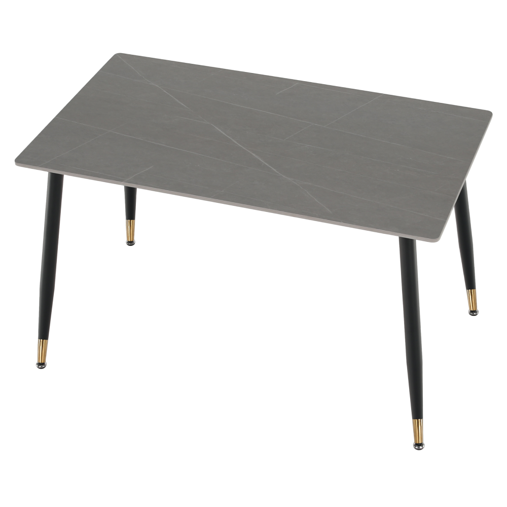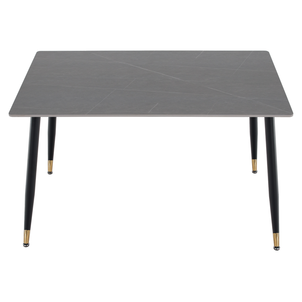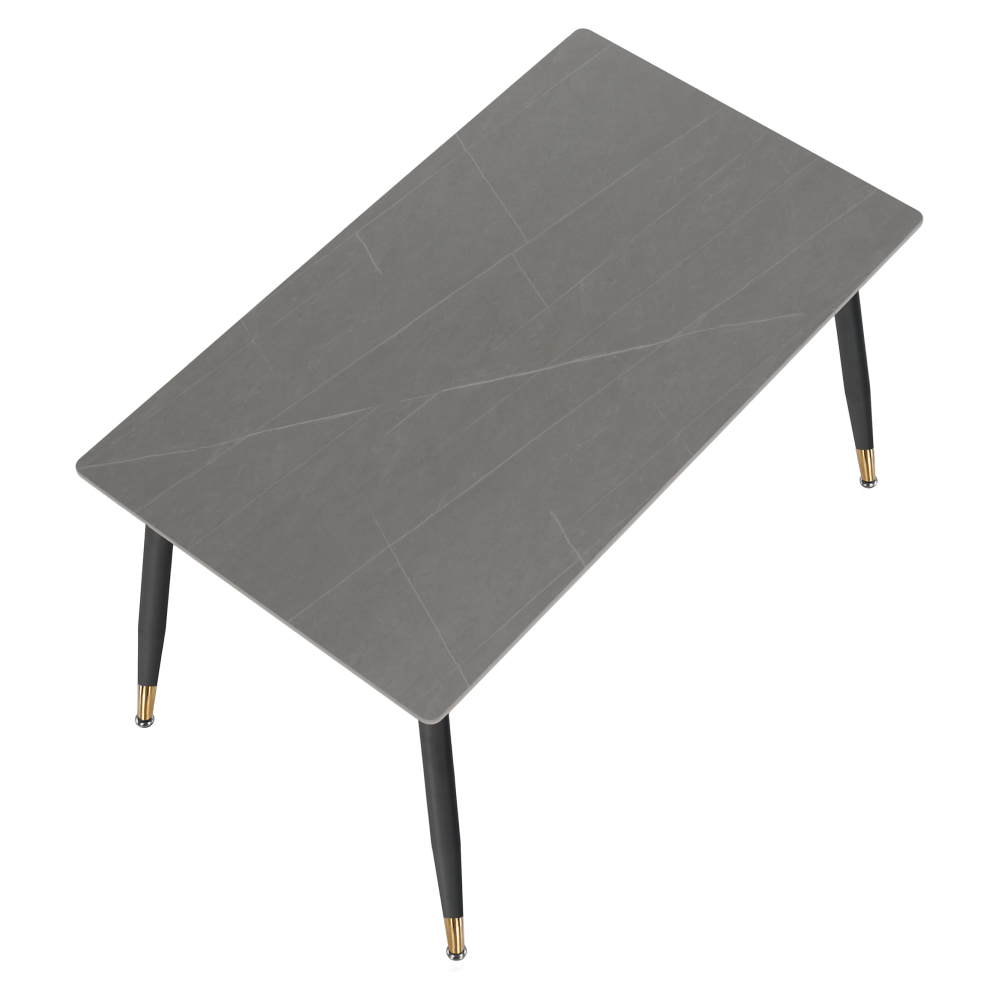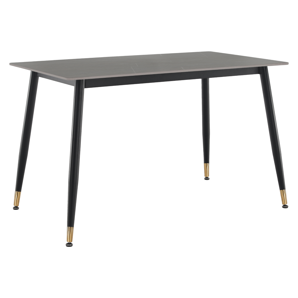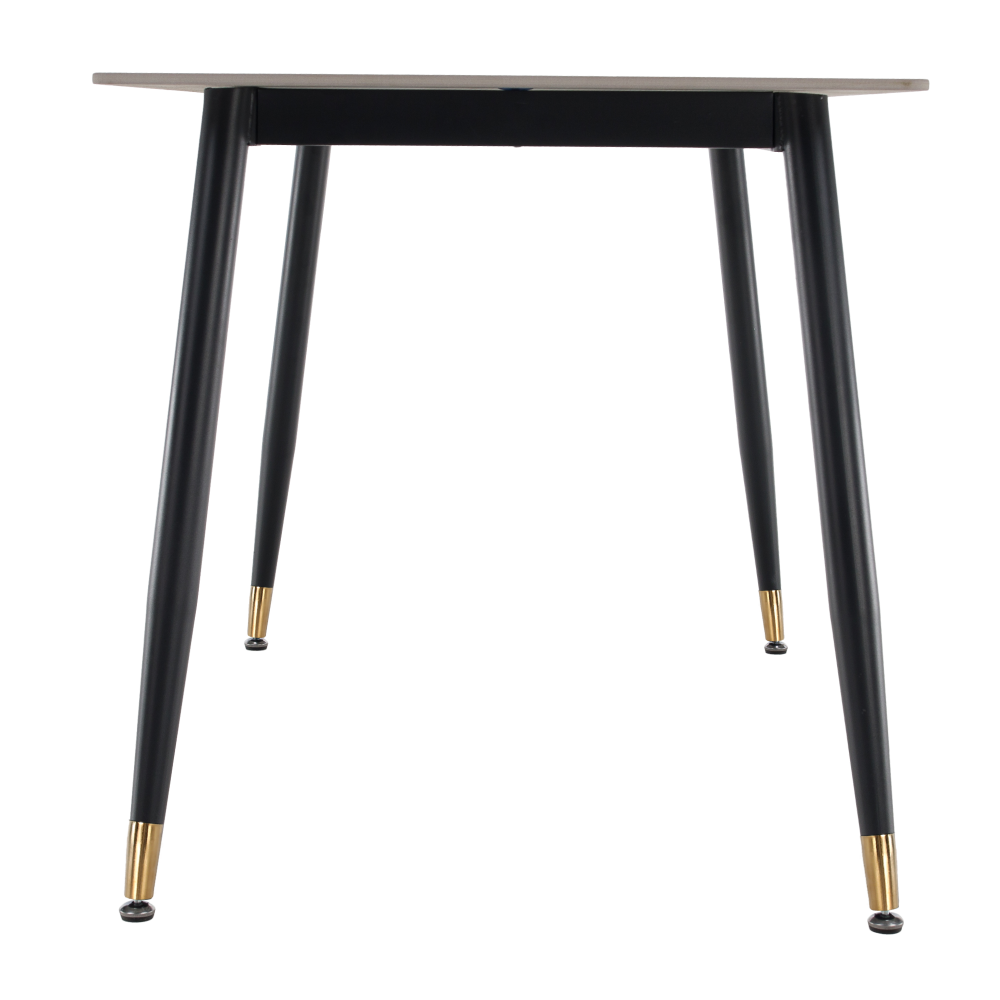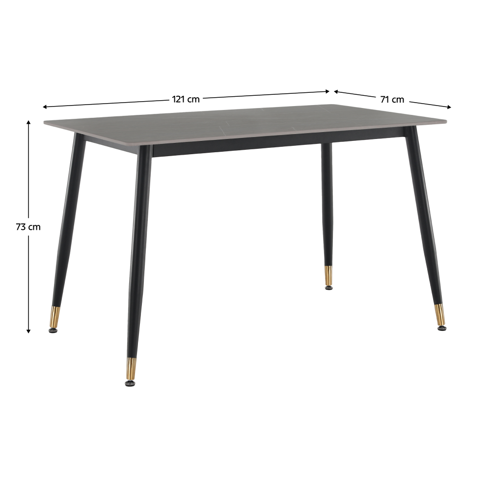 Pevnosť zabezpečujú čierne oceľové nohy so zlatým detailom v spodnej časti, ktoré dodávajú stolu moderný a jemne luxusný vzhľad. Kombinácia kameňa a kovu vytvára harmonický celok s dlhou životnosťou.