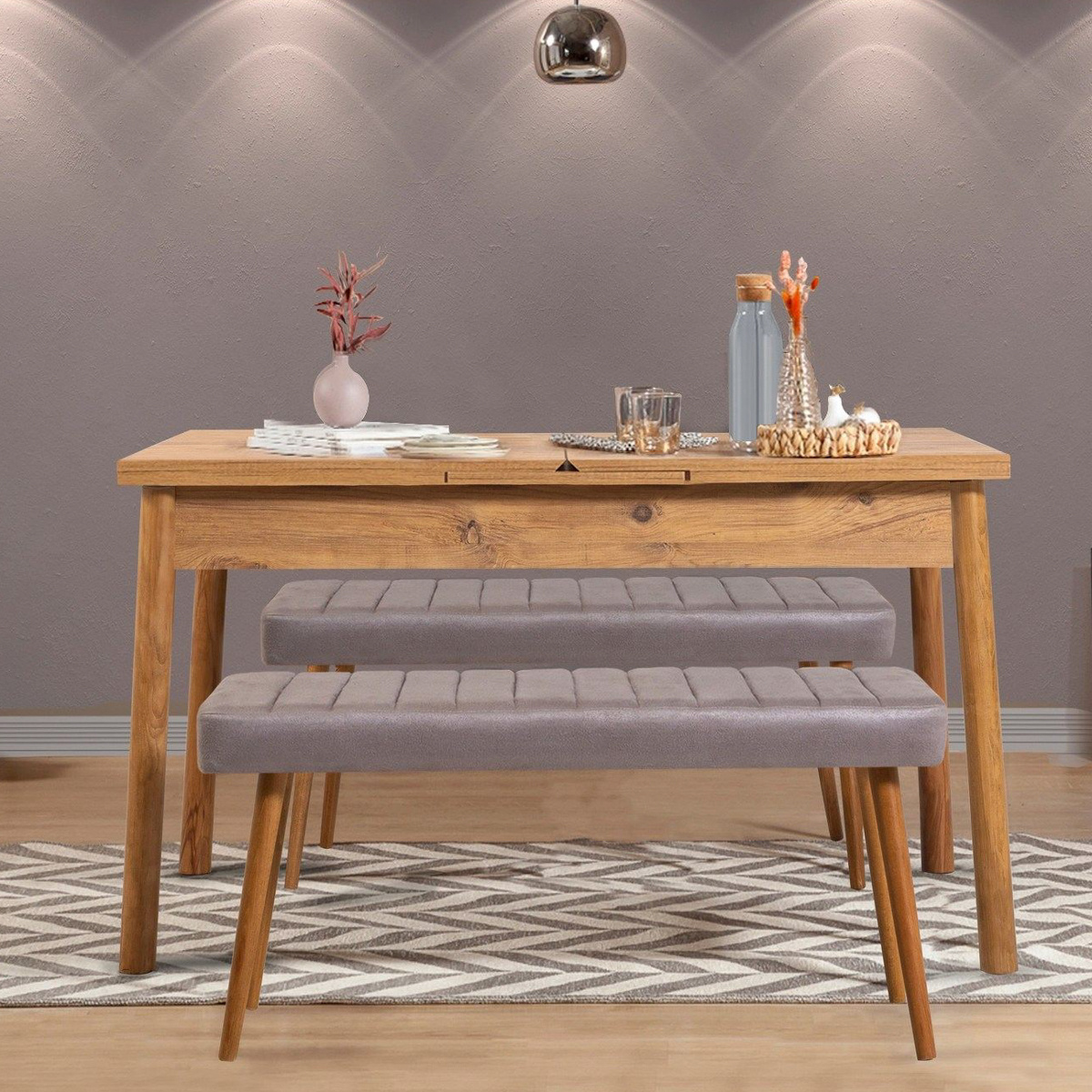 Tento jedálenský stôl je vďaka svojej rozkladacej funkcii všestranný a praktický. Či už organizujete malú stretnutie alebo veľkolepú hostinu, jednoducho stôl rozložte, aby sa k nemu zmestilo viac hostí. Drevené nohy poskytujú stabilitu a oporu, čím zaisťujú bezpečné a príjemné stolovanie pre všetkých.