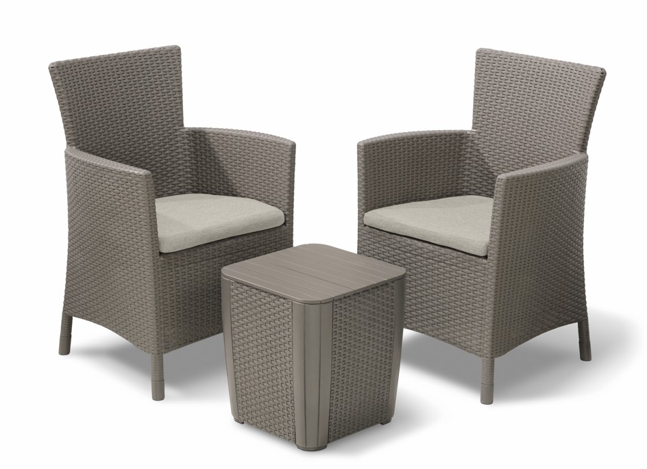 Moderný balkónový set EYWA má sivé podušky, ktoré poskytujú pohodlné sedenie. Balkónový set je vyrobený z kvalitných a odolných materiálov. Veľkým plusom je snímateľný poťah na poduškách a ich skladnosť. Záhradný set EYWA má v cene dve kreslá + podušky a menší stolík. Stolík má možnosť úložného miesta.