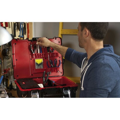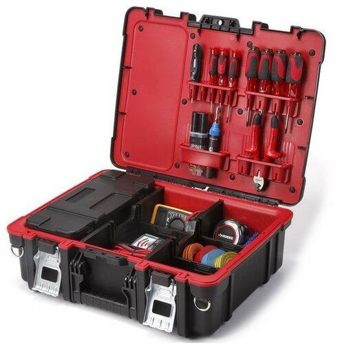 Praktická skrinka Technican box s veľkým objemom pre domácich majstrov. Vnútro uľahčuje skladovanie náradia rôznych veľkostí, vyberateľný organizér s prepážkami umožňuje ľahší prístup k najčastejšie používanému náradiu. Vďaka pohodlnému držadlu je možné kufrík na náradie bez problémov prenášať. Produkt bol vyrobený z vysoko kvalitných materiálov, čo zaisťuje jeho stálosť a odolnosť. Odolné kovové pracky na uzavretie boxu.