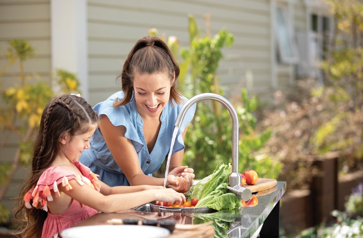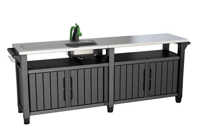 Veľký mobilný stôl UNION COOK 415l je vyrobený v grafitovej farbe. V cene je pracovná doska s drezom a veľkým úložným priestorom, ktorý oceníte hlavne pri záhradných grilovačkách a oslavách. Stôl má 2 priestranné skrinky s dvojitými dverami a praktickou rukoväťou s háčikom na uteráky.