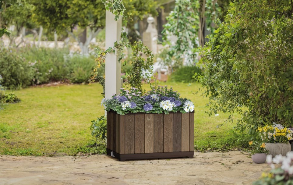 Záhradný kvetináč DECO BLOCK PLANTER je moderným a štýlovým doplnkom na každú terasu alebo balkón. Kvetináč je vyrobený z revolučného materiálu DecoCoat, čo je kvalitný lisovaný plast v dokonalej imitácii dreva, ktorá je na nerozoznanie od skutočného dreva. Integrovaný a inteligentný zavlažovací systém zabezpečuje ideálnu hydratáciu pre rastliny, praktický odtokový kelímok navyše ukazuje hladinu vody, čím zjednodušuje starostlivosť o rastliny a znižuje potrebu častého zalievania.