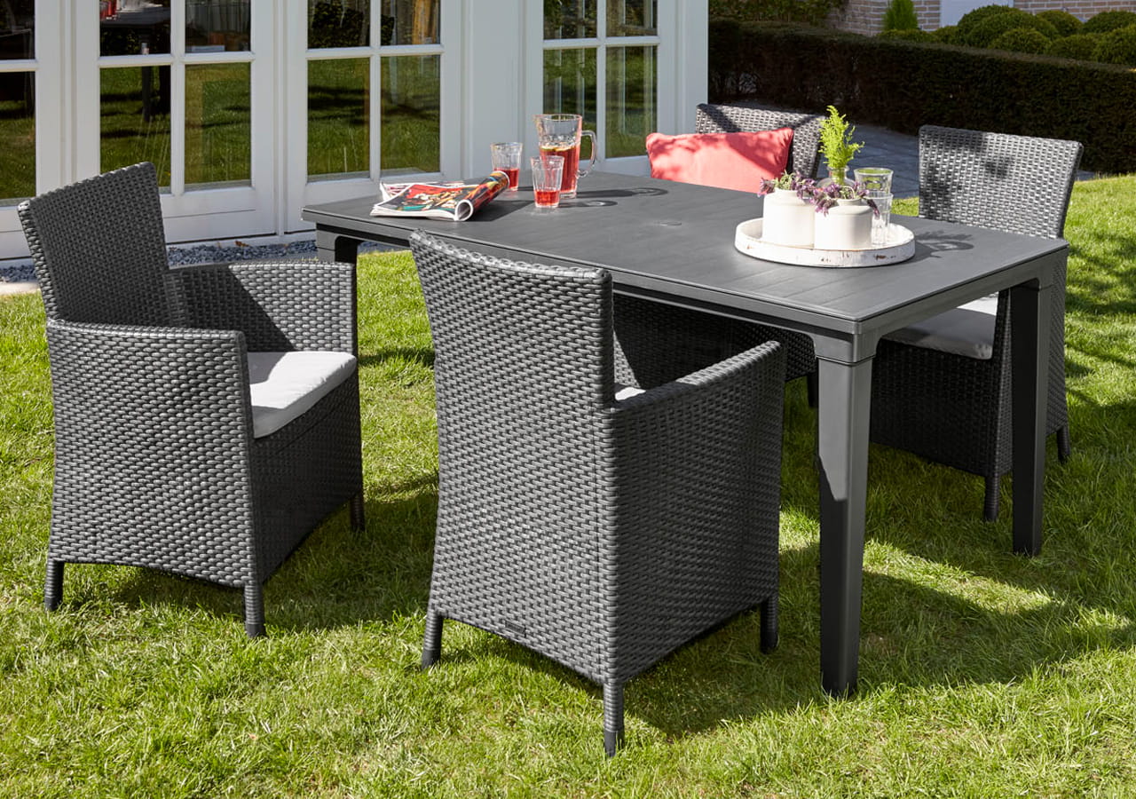 Záhradný stôl MORROW vo farbe grafit je ideálny pre každého, kto hľadá štýl a eleganciu. Stôl je vhodný do väčšieho priestoru pre posedenie s rodinou či priateľmi. Stôl má prvky imitácie dreva, kvalitný materiál zaručuje dlhú životnosť a je odolný voči nepriazni počasia a UV žiareniu. Veľkým plusom je jednoduchá údržba a otvor na slnečník (48mm).