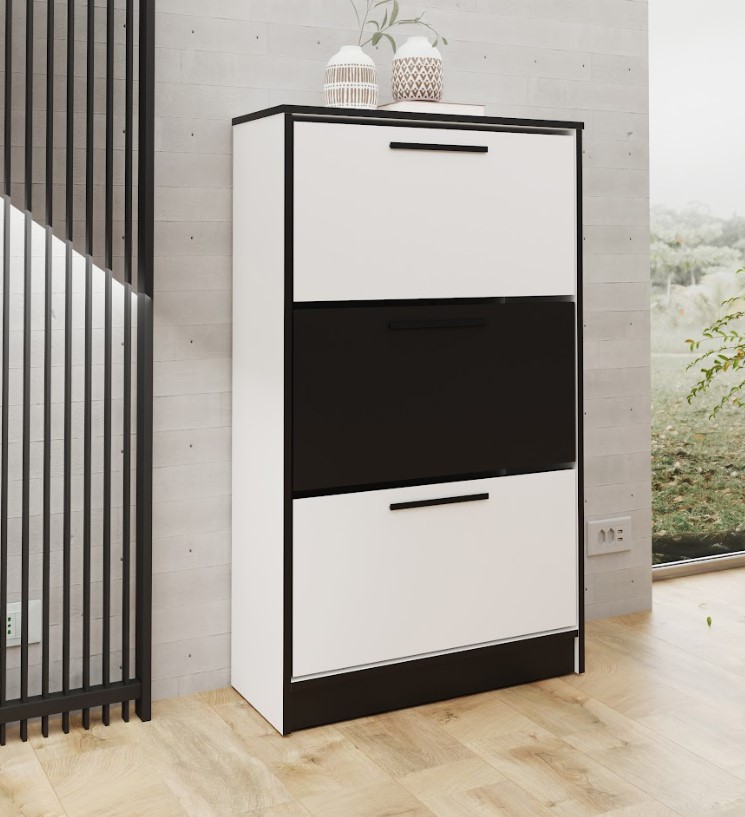 Priestranný botník BENY SZNB01 má úložný priestor, ktorý ponúka v 3 skrinkách s výklopnými čelami. Navyše každá skrinka má dve police. Botník v neutrálnom bielom prevedení s čiernymi doplnkami zapasuje do každého interiéru.