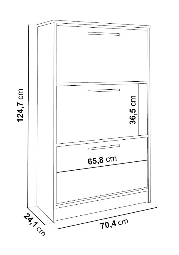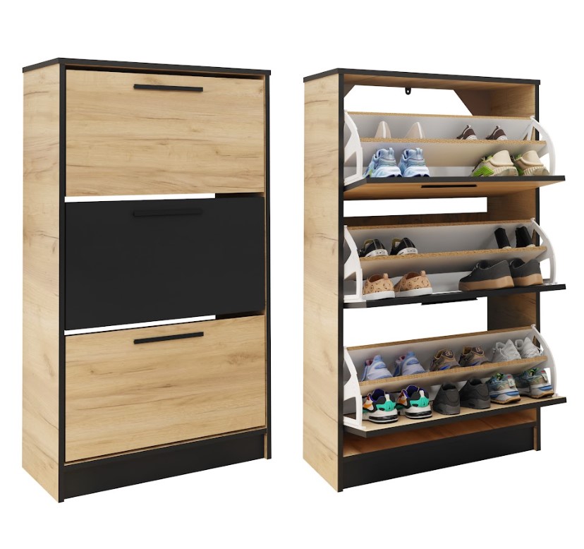 Priestranný botník BENY SZNB01 má úložný priestor, ktorý ponúka v 3 skrinkách s výklopnými čelami. Navyše každá skrinka má dve police. Botník v praktickom prevedení s čiernymi doplnkami zapasuje do každého interiéru. Vyberte si ten správny botník do Vašej predsiene.