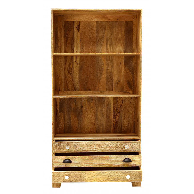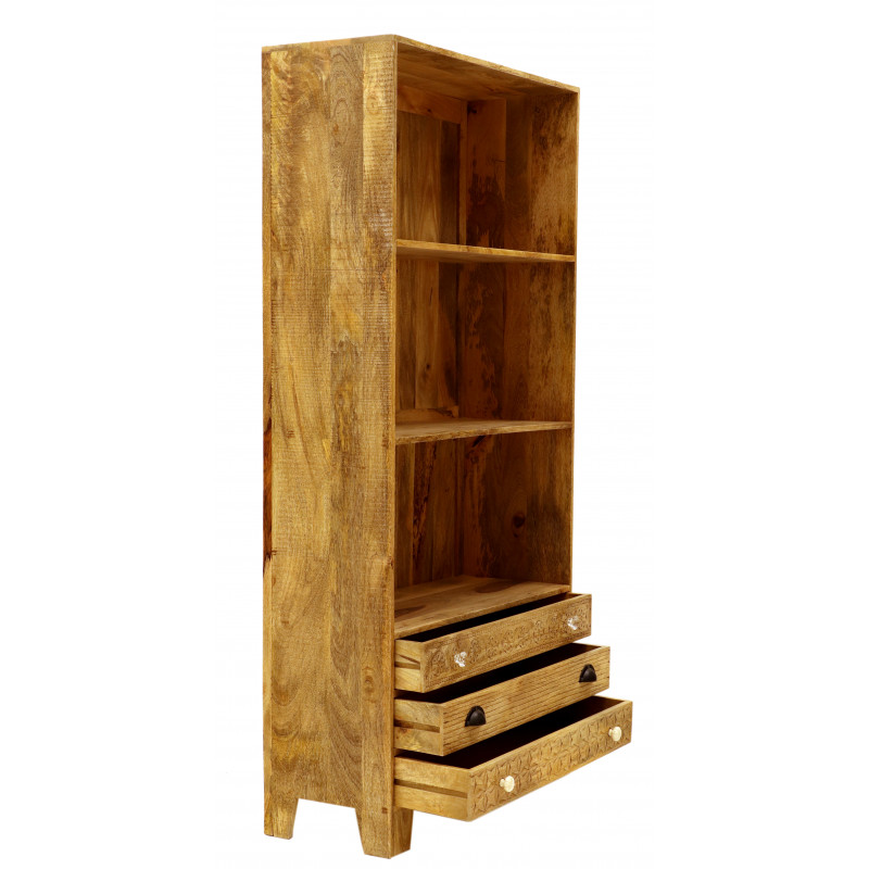 Knižnica z masívu Manu je vyrobená z kvalitného masívneho mangového dreva. Knižnica z masívu je vyrobená z indického manga. Obsahuje tri police a tri zásuvky. Knižnice z masívu, ktoré máme skladom, si môžete pozrieť v našom showroome. Indický koloniálny nábytok mango masív.