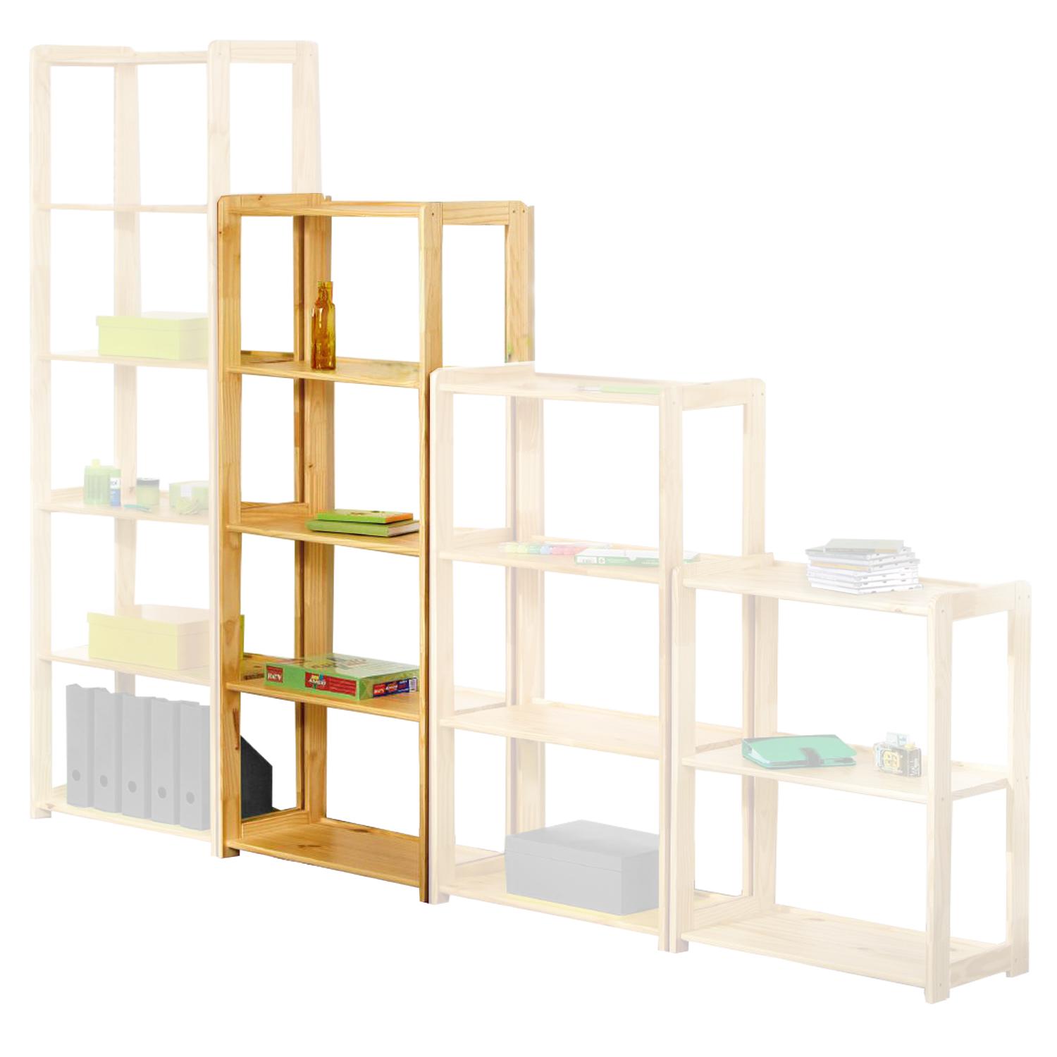 Knižnica STYL 5 políc v prevedení masív borovica lak je pevná a do piatich políc uloží najrôznejšie veci. V obývacej izbe sa bude hodiť na knihy a suveníry, v kancelárii na dokumenty, v študentskej či detskej izbe potom na hračky a učivo. Využijete ju samostatne alebo spolu s ďalšími knižnicami STYL.