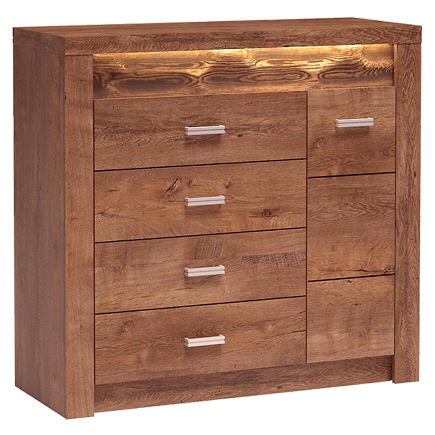 Veľká, stabilná a odolná komoda. Má štyri priestranné zásuvky, do ktorých môžete uložiť množstvo oblečenia, dokumentov a doplnkov. Na bočnej strane je skrinka s poličkou v strede, ktorá delí priestor na polovicu, takže nábytok využijete na 100%. Komoda sa skvele hodí do spálne, obývačky, ale aj do pracovne. Nábytok sa zmestí do mnohých aranžmánov, no aj sám o sebe dobre vyzerá a upúta. Kovové úchytky zdôrazňujú originalitu nábytku. Dostupné v troch farbách.