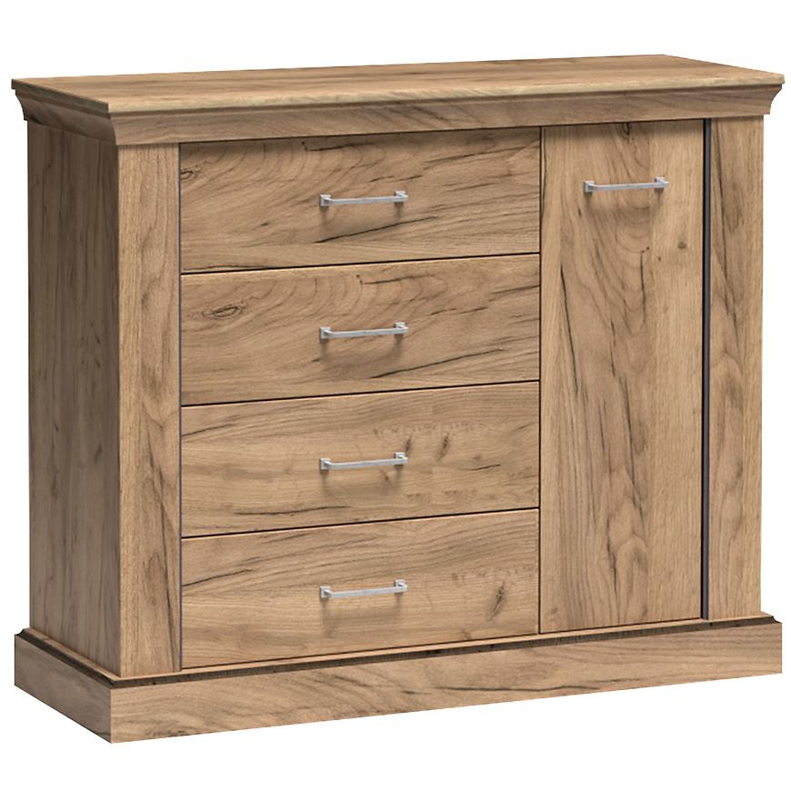 Komoda so štyrmi priestrannými zásuvkami šírky 59,6 cm a skrinkou s jednou policou. Zmestí sa do nej veľa oblečenia, doplnkov, dokumentov. Vďaka svojej konštrukcii je organizácia veľmi jednoduchá. Komoda si nájde svoje miesto v obývačke, spálni alebo aj jedálni, vďaka svojmu dizajnu a jedinečnému štýlu bude vyzerať skvele v každej miestnosti. Kovové úchytky dokonale ladia so konštrukciou a vzhľadom nábytku. Dobrou vlastnosťou tejto komody je aj tiché zatváranie skriniek.