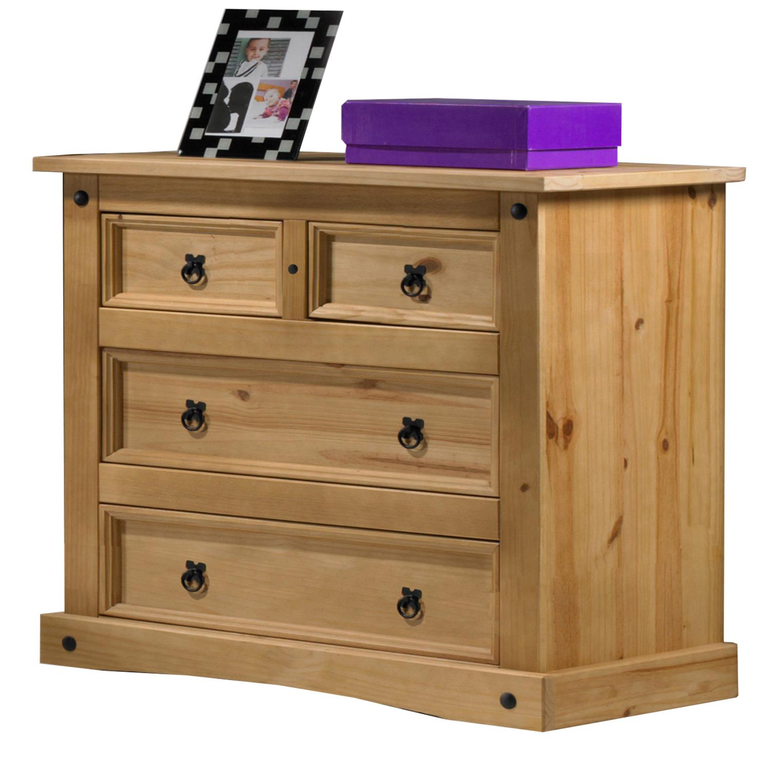 Komoda CORONA vosk 16263 v prevedení masív borovica je voskovaná v medovom odtieni a obsahuje 2 malé a 2 veľké zásuvky. Komoda rustikálného vzhľadu je zdobená kovovými úchytkami v čiernej farbe. Komoda so zásuvkami nájde svoje využitie takmer všade. Komoda je súčasť zostavy Corona.