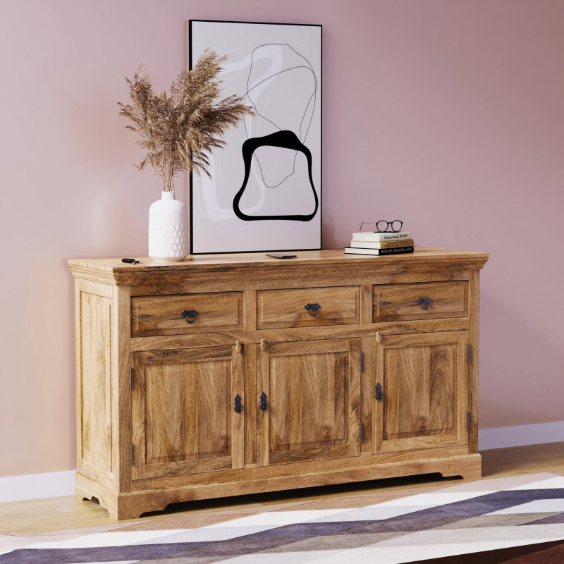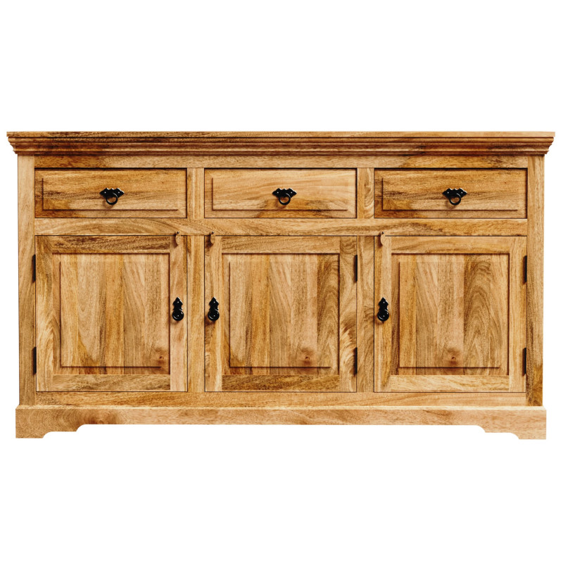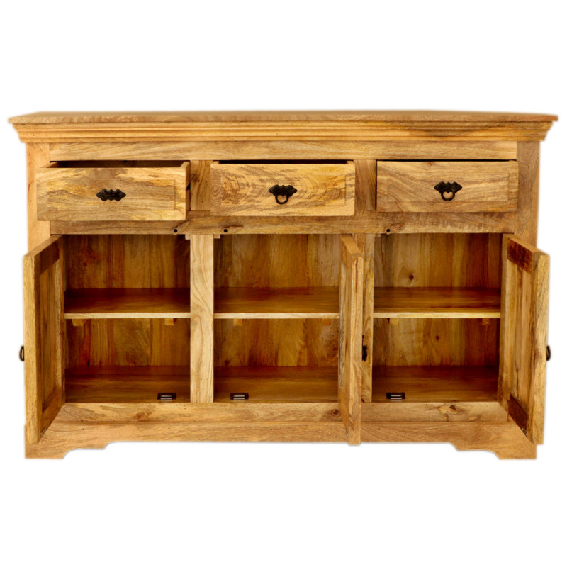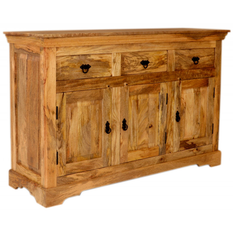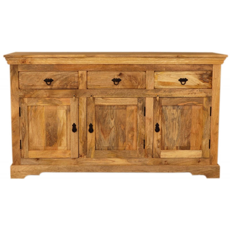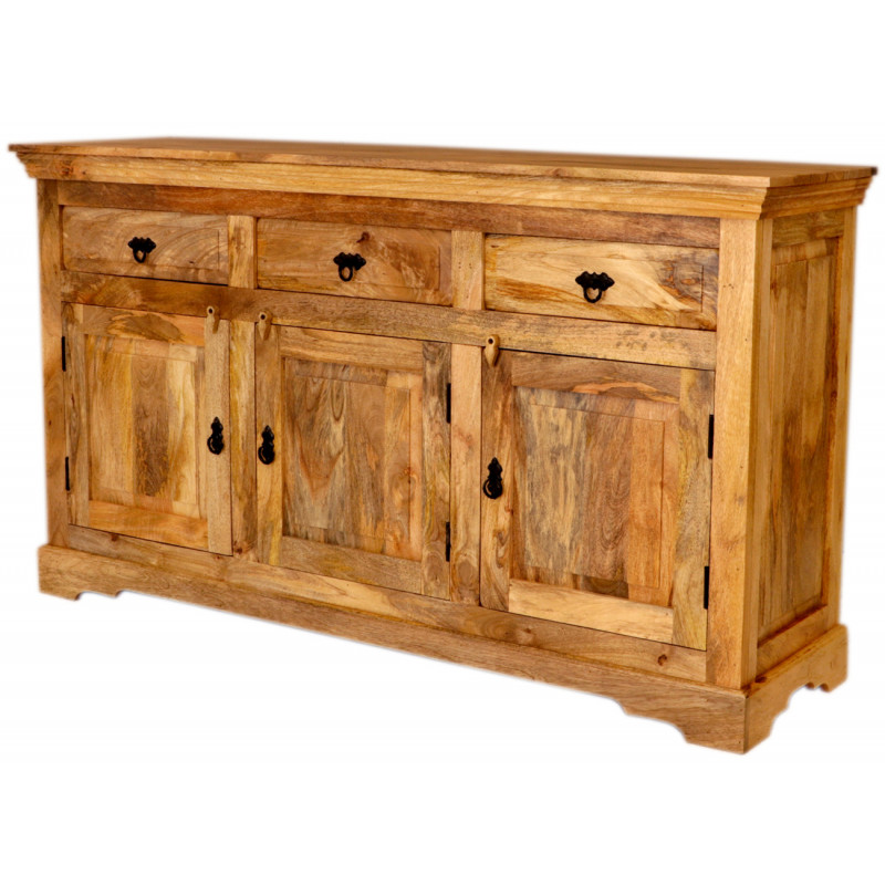 Komoda z masívu Guru je vyrobená z kvalitného masívneho mangového dreva.Komoda je vyrobená z masívu mango, má tri zásuvky na vrchu a tri spodné dvierka s kovovým úchytom. Komody z masívu, ktoré máme skladom, si môžete pozrieť v našom showroome. Indický koloniálny nábytok mango masív.