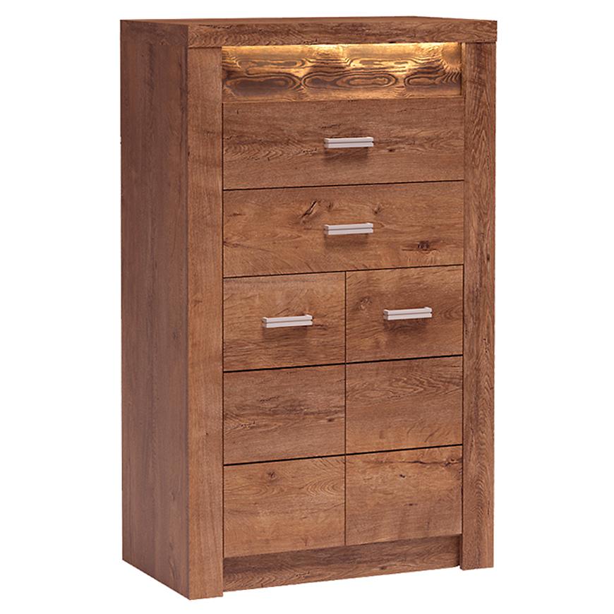 Komoda vysoká 127 cm. Spodná časť je dvojdverová skriňa s odkladacou policou, ktorá delí priestor na polovicu, vďaka čomu sa dá priestor v komode využiť na 100%. Komoda má dve zásuvky, otvárané krásnymi kovovými úchytkami. LED stolová doska dodatočne diverzifikuje vzhľad nábytku. Dostupné v troch farbách.