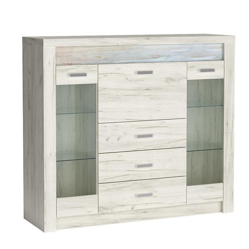Vysoká komoda s vitrínami po stranách s dvojitými sklenenými policami vo vnútri. V strede máme tri hlboké zásuvky a bar. Vitríny sú ideálne na vystavenie kníh, porcelánu alebo suvenírov. Kus nábytku toho veľa pojme, je priestranný a originálny, pokiaľ ide o vzhľad. Hodí sa do každej izby, obývačky, jedálne či haly. Svojím strihom zaujme nejedného hosťa. Kovové úchyty zdôrazňujú pozornosť k detailom. Možnosť dokúpenia nábytku s plnými prednými časťami. Dostupné v troch farbách.