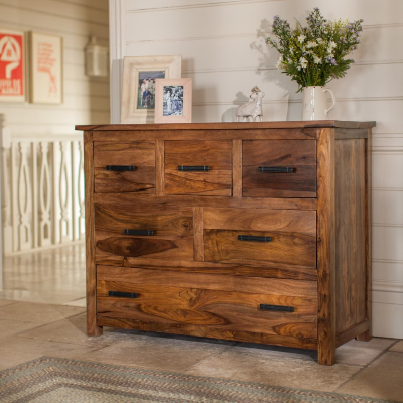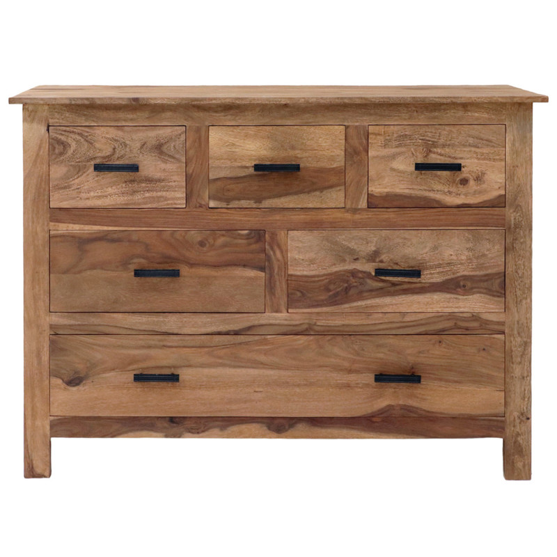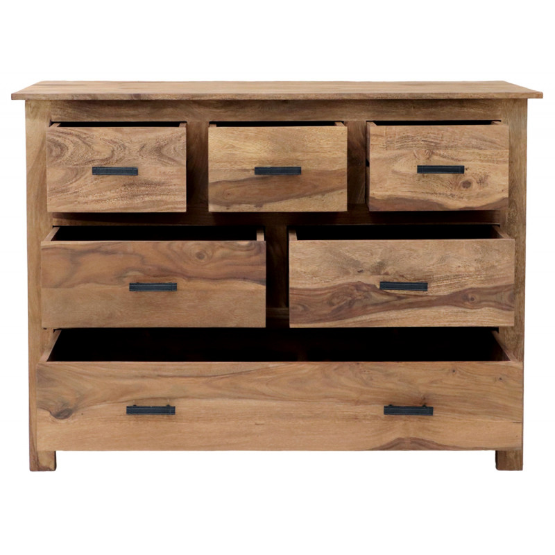 Komoda masív Rami je vyrobená z kvalitného masívneho palisandrového dreva.Komoda z masívu je vyrobená z indického palisandru. Obsahuje šesť zásuviek v rôznych veľkostiach. Komody z masívu z masívu, ktoré máme skladom, si môžete pozrieť v našom showroome. Indický koloniálny nábytok palisander (sheesham) masív.