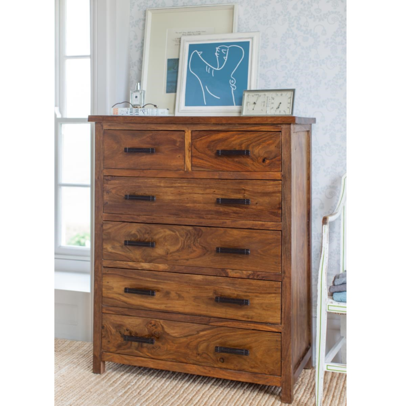 Komoda masív Rami je vyrobená z kvalitného masivného palisandrového dreva.Komoda z masívu je vyrobená z indického palisandru. Obsahuje šesť zásuviek. Komody z masívu, ktoré máme skladom, si môžete pozrieť v našom showroome. Indický koloniálny nábytok palisander (Sheesham) masív.