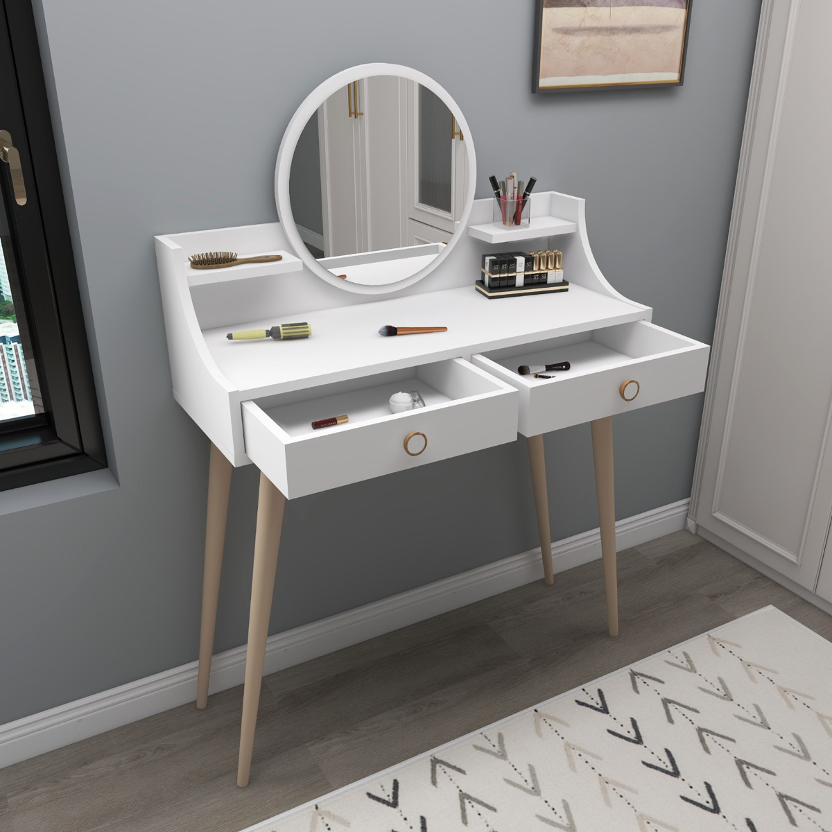 Súčasťou balenia je aj elegantné zrkadlo umiestnené v ideálnom uhle, ktoré zaistí, že každý detail vášho make-upu bude perfektný. Prírodné nohy z bukového dreva dodávajú stolíku nielen stabilitu, ale aj vizuálny kontrast k čisto bielemu korpusu. Tento dizajnový prvok vnáša do interiéru pocit tepla a prirodzenosti, čím vytvára harmonickú atmosféru. Výsledkom je premyslený a vkusný doplnok, ktorý sa stane skutočnou ozdobou vášho kozmetického kútika.