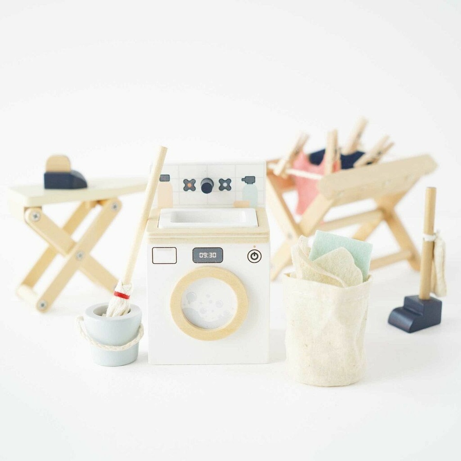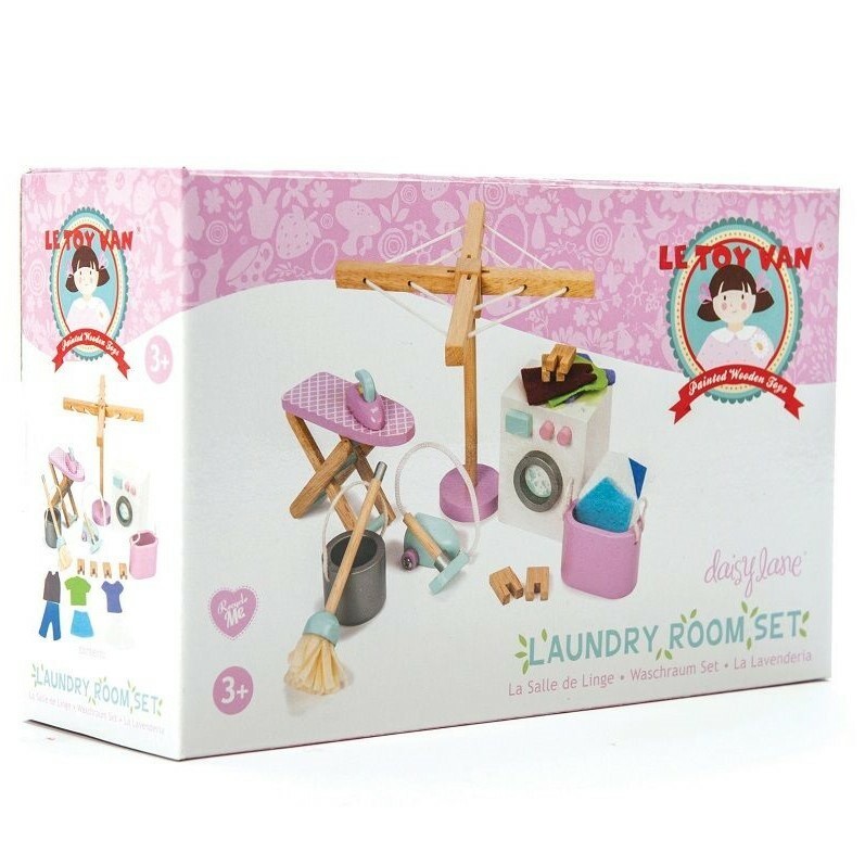 Pranie bielizne bude s týmto setom do práčovne oveľa zábavnejšie. Toto krásne vybavenie o 16 ks je vyrobené z vysoko kvalitného dreva s certifikáciou FSC® a bude sa perfektne hodiť do domčekov pre bábiky. Nájdete tu práčku, sušiak na bielizeň, žehličku a dosku na žehlenie, 4 štipce, plstené oblečenie, zmeták a vedierko, vysávač a ďalšie. Veľkostne sa hodí do domčekov pre bábiky od Le Toy Van.Hlavné vlastnosti:
