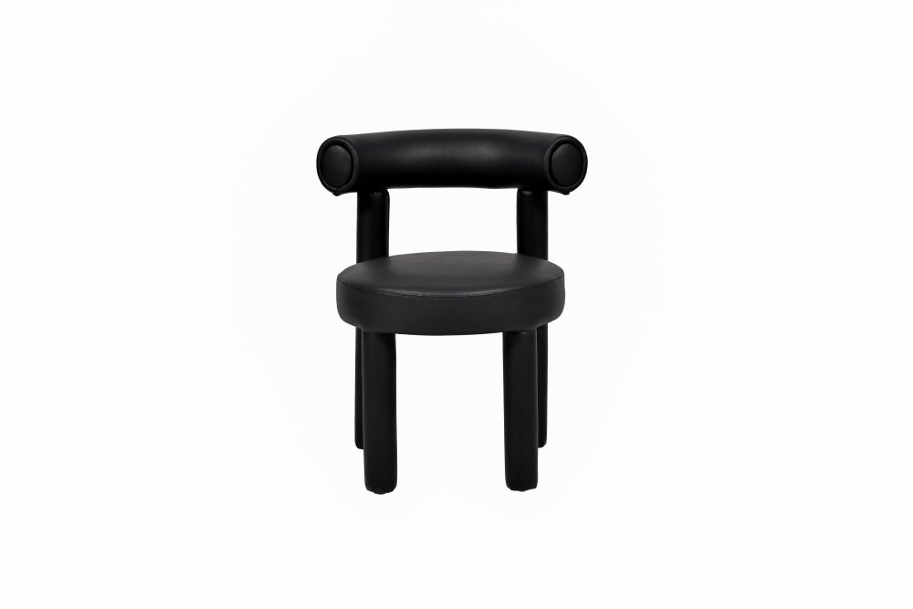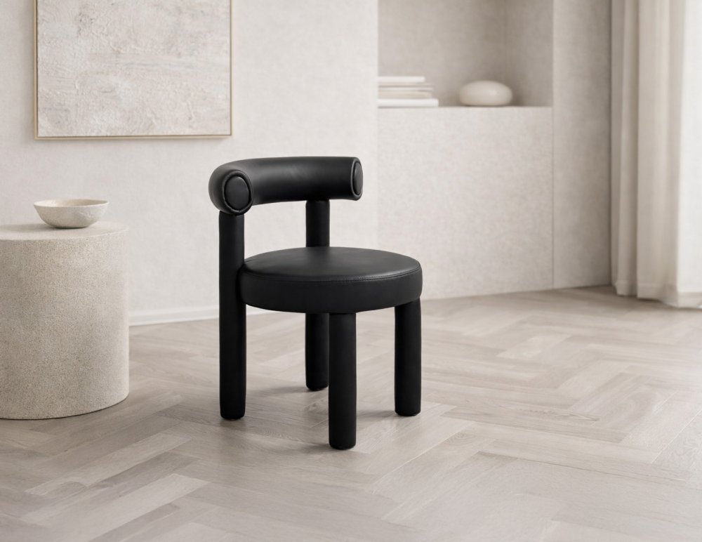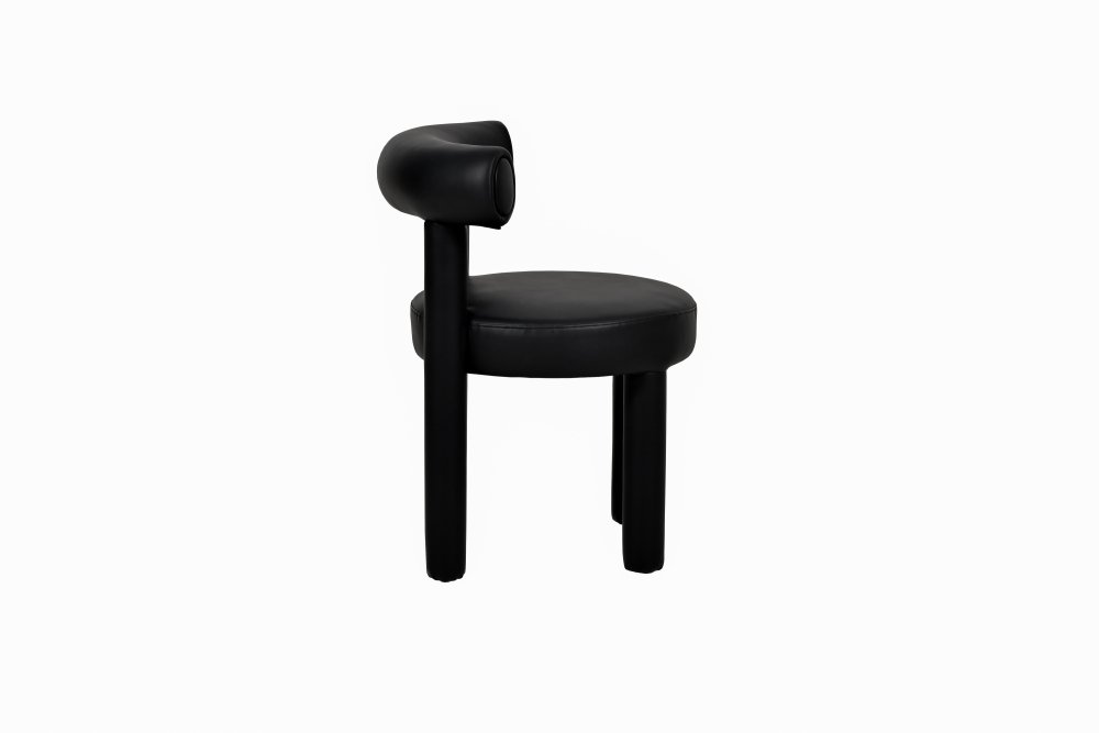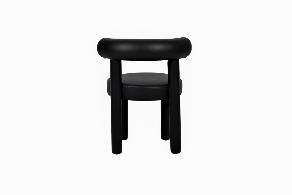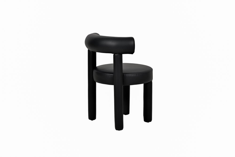Moderná, čalúnená stolička z čiernej umelej kože. Jej jednoduchý dizajn je založený na módnych, zaoblených tvaroch a konštrukcia je celá potiahnutá látkou.