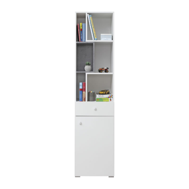 Moderná detská izba SIGMA predstavuje komplexný a nadčasový nábytok pre študenta, alebo študentku. Jednoduchosť, čisté línie a prírodné farebné kombinácie vytvárajú útulný priestor pre trávenie voľného času a učenia. Všetky časti sektoru Sigma zabezpečujú možnosť vytvoriť detskú izbu podľa Vašich predstáv a potrieb. Regál má jemné kovové úchytky, matný povrch, zásuvku s valčekovými vodidlami a možnosť otvárania dvierok na ľavu, alebo pravú stranu.