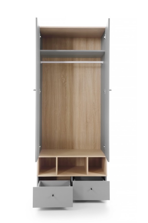 Šatníková skriňa ORO OR01 vytvára harmonické prostredie, ktoré podporuje kreativitu, zvedavosť aj učenie. Neutrálne tóny sivej a dekoru dubu, doplnené jemnými čiernymi úchytkami, prinášajú do izby nadčasový štýl a príjemnú atmosféru. Nábytok prirodzene zapadne do každého interiéru a rastie spolu s vaším dieťaťom od prvých krôčikov fantázie až po školské povinnosti. Šatníková skriňa je dvojdverová s policami, zásuvkami a vešiakovou tyčou.