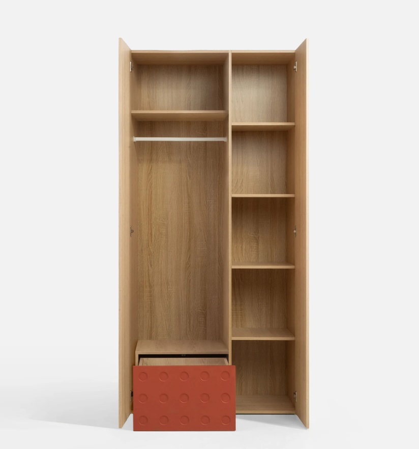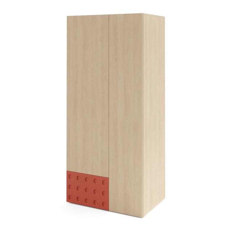 Šatníková skriňa SALSA SL2 spája prírodný vzhľad dreva a dynamickým červeným akcentom, čo pôsobí energicky a originálne. Jemné kruhové reliéfy na čelách dodávajú nábytku moderný geometrický charakter. Vďaka modulárnosti nábytku SALSA dokonale zapadne do rôznych typov izieb a podporuje každodenný poriadok, ktorý vydrží. Predná strana je dekorovaná jemnou, precízne vyhotovenou rezbou v podobe kruhov. Šatníková skriňa je priestranná dvojdverová so zásuvkou, policami a vešiakovou tyčou, otvorenie je systémom klik-klak, bez úchytiek.
