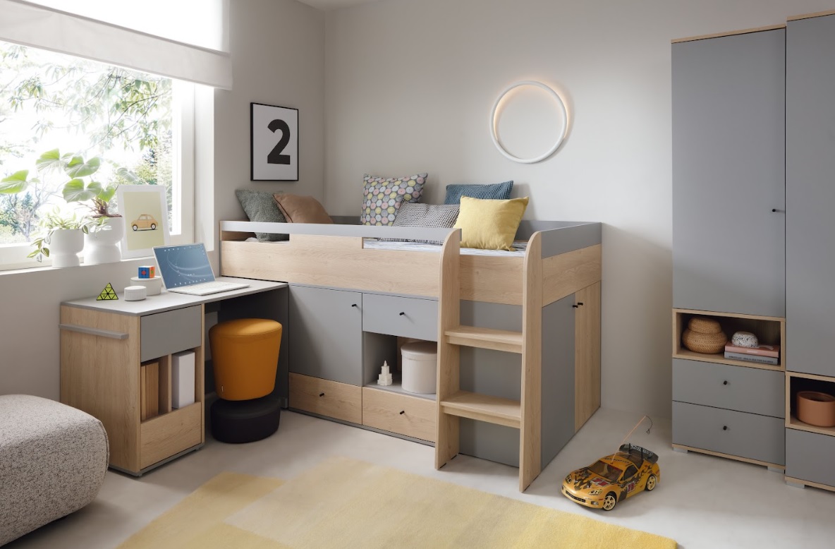 Skriňa ORO OR02 vytvára harmonické prostredie, ktoré podporuje kreativitu, zvedavosť aj učenie. Neutrálne tóny sivej a dekoru dubu, doplnené jemnými čiernymi úchytkami, prinášajú do izby nadčasový štýl a príjemnú atmosféru. Nábytok prirodzene zapadne do každého interiéru a rastie spolu s vaším dieťaťom od prvých krôčikov fantázie až po školské povinnosti. Skriňa je priestranná jednodverová s policami a zásuvkami.