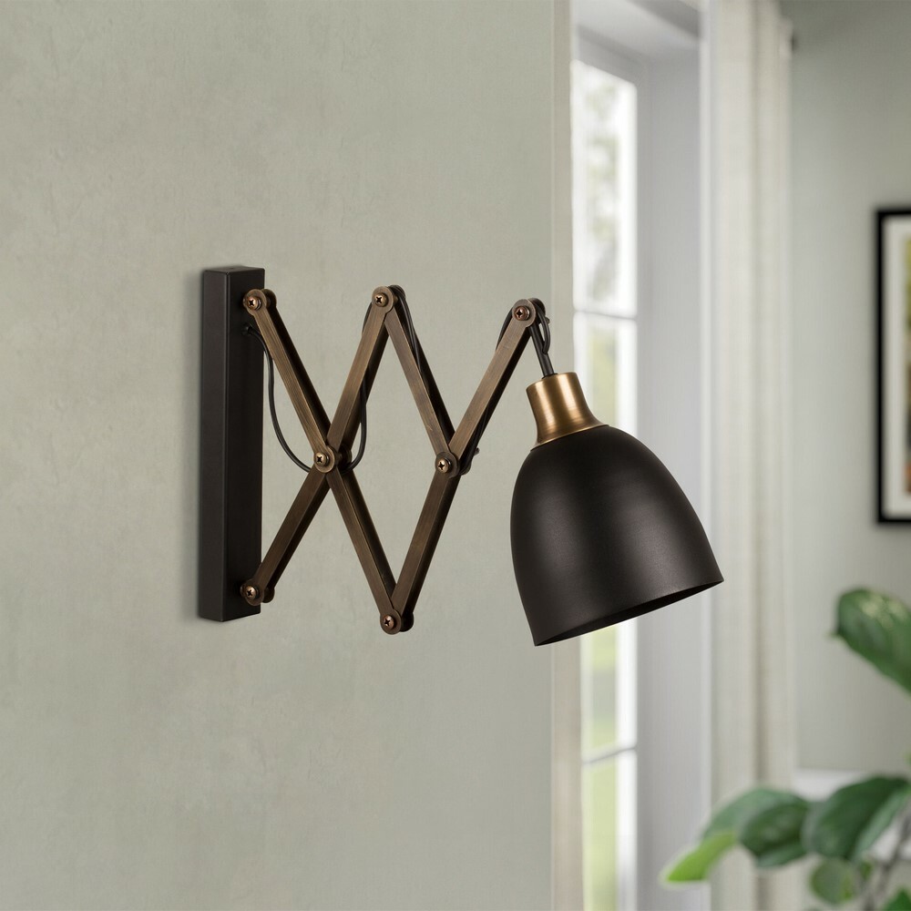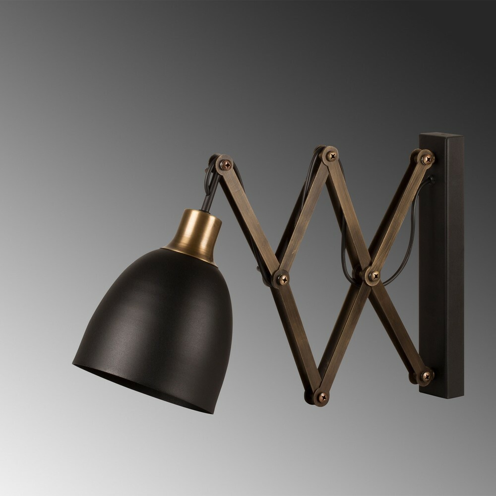 Toto nástenné svietidlo v retro industriálnom štýle kombinuje kovové telo v čiernej farbe s ramenom v mosadznej farbe, ktoré pôsobia elegantne a nadčasovo. Jeho hlavnou výhodou je nastaviteľná nožnicová konštrukcia, vďaka ktorej možno ľahko meniť vzdialenosť svietidla od steny v rozmedzí 35 až 62 cm. To umožňuje presne nasmerovať svetlo podľa aktuálnych potrieb, či už pri čítaní, práci alebo ako doplnkové osvetlenie.