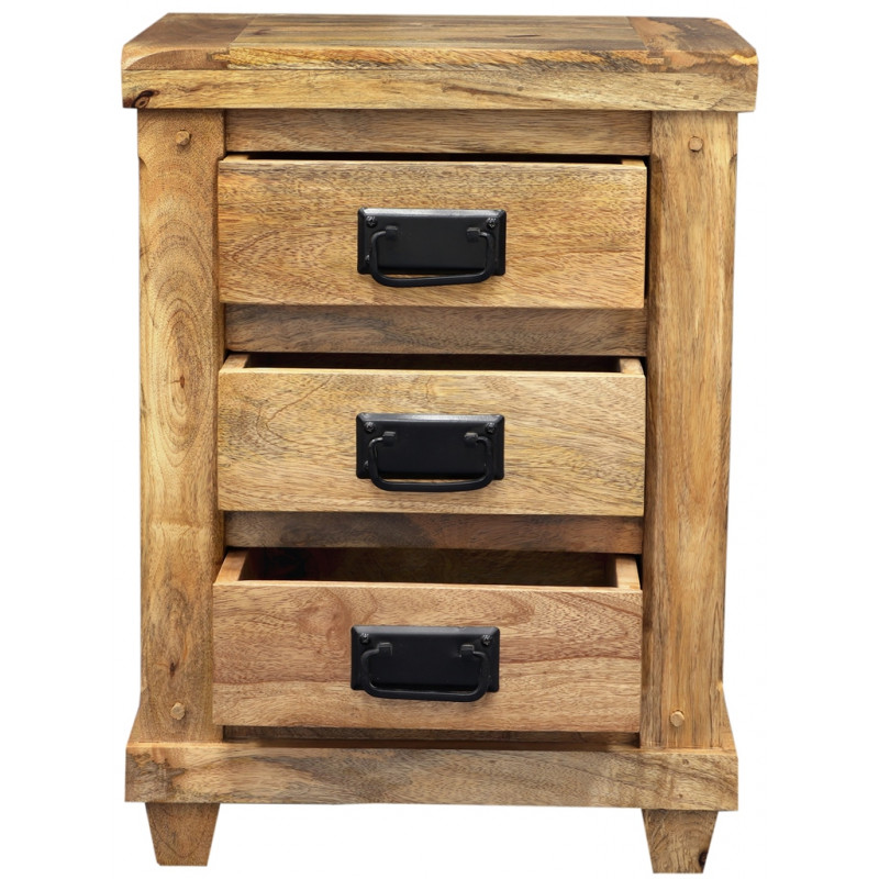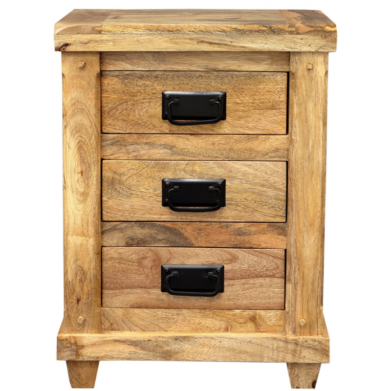 Nočný stolík Devi z masívu je vyrobený z kvalitného masívneho mangového dreva, ktorému dominujú kovové madlá. S tromi priestrannými zásuvkami ponúka dostatok úložného priestoru pre vaše osobné veci. Jeho dizajn a detaily z masívu palisander robia z tohto stolíka krásny doplnok do vašej spálne. S Devi nočným stolíkom si získate nielen praktický nábytok, ale aj kúsok exotického umenia priamo z Indie.Nočný stolík je vyrobený z masívu mango, ma tri šuplíky s kovovými úchytmi. Nočné stolíky z masívu, ktoré máme skladom, si môžete pozrieť v našom showroome. Indický koloniálny nábytok mango masív.