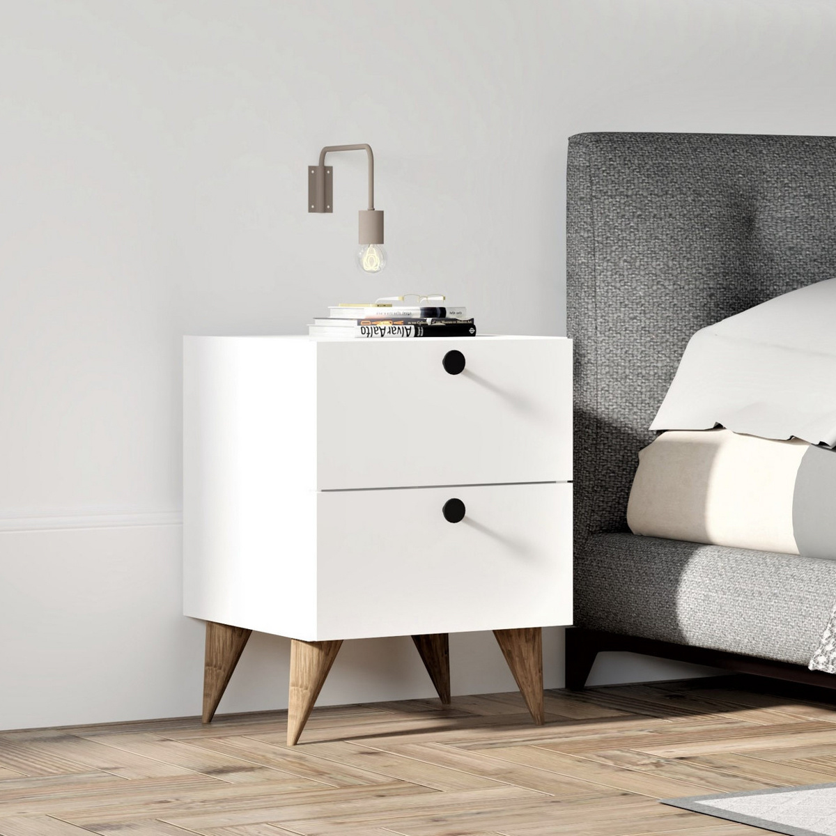 Vneste do svojej spálne pokoj, čistotu a praktickosť s týmto elegantným škandinávskym nočným stolíkom. Jeho minimalistický dizajn, jemné línie a svieža biela farba dokonale zapadnú do moderného aj tradične ladeného interiéru a vytvoria ideálne prostredie na oddych.Stôl je vyrobený zo 100% melamínom potiahnutej drevotriesky s hrúbkou 18 mm, ktorá zaručuje vysokú odolnosť proti opotrebeniu, pevnosť a jednoduchú údržbu. Jeho jednoduchá, ale stabilná konštrukcia je navrhnutá tak, aby slúžila mnoho rokov bez straty estetiky.S rozmermi 40 × 55 × 42 cm ponúka stolík praktické riešenie úložného priestoru. Horná plocha je ideálna na umiestnenie lampy, budíka alebo knihy, zatiaľ čo zásuvka a otvorená polica poskytujú miesto na odloženie drobností, ktoré potrebujete mať večer po ruke. Vďaka ľahkej montáži a hladkému povrchu je stolík nielen krásny, ale aj praktický na každodenné používanie.Hlavné výhody produktu