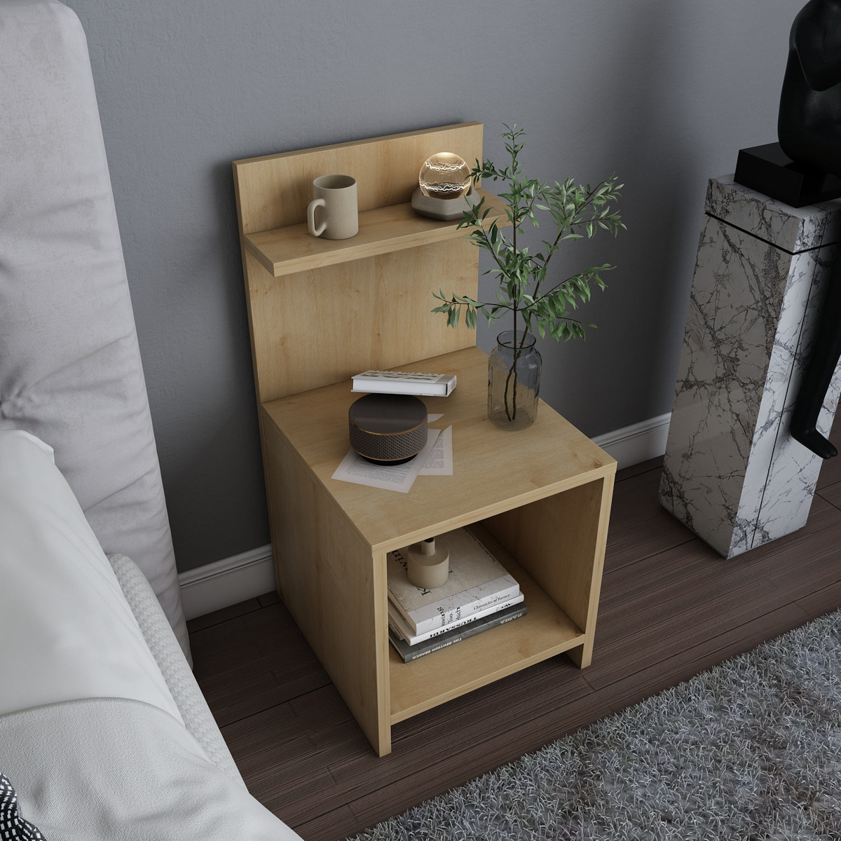 Vďaka rozmerom 35,6 x 37,4 x 72 cm ponúka stolík dostatok priestoru bez toho, aby pôsobil ťažkopádne. Je ideálny pre spálne, ktoré uprednostňujú čistotu línií a prírodnú estetiku, a skvele doplnia ako tradičné, tak aj moderné vybavenie.