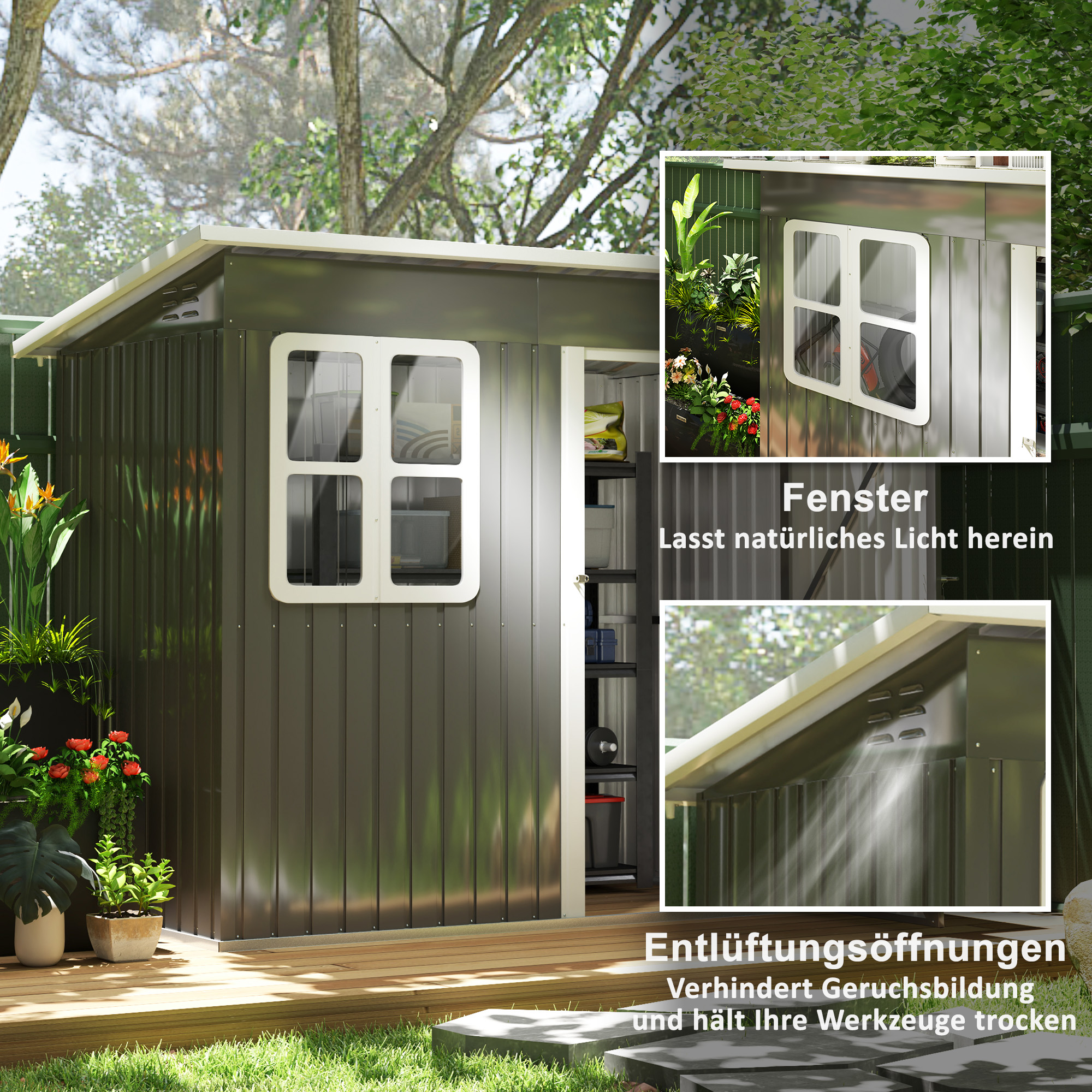 - Vetracie otvory v záhradnom domčeku zabezpečujú cirkuláciu vzduchu a znižujú vlhkosť a zápach