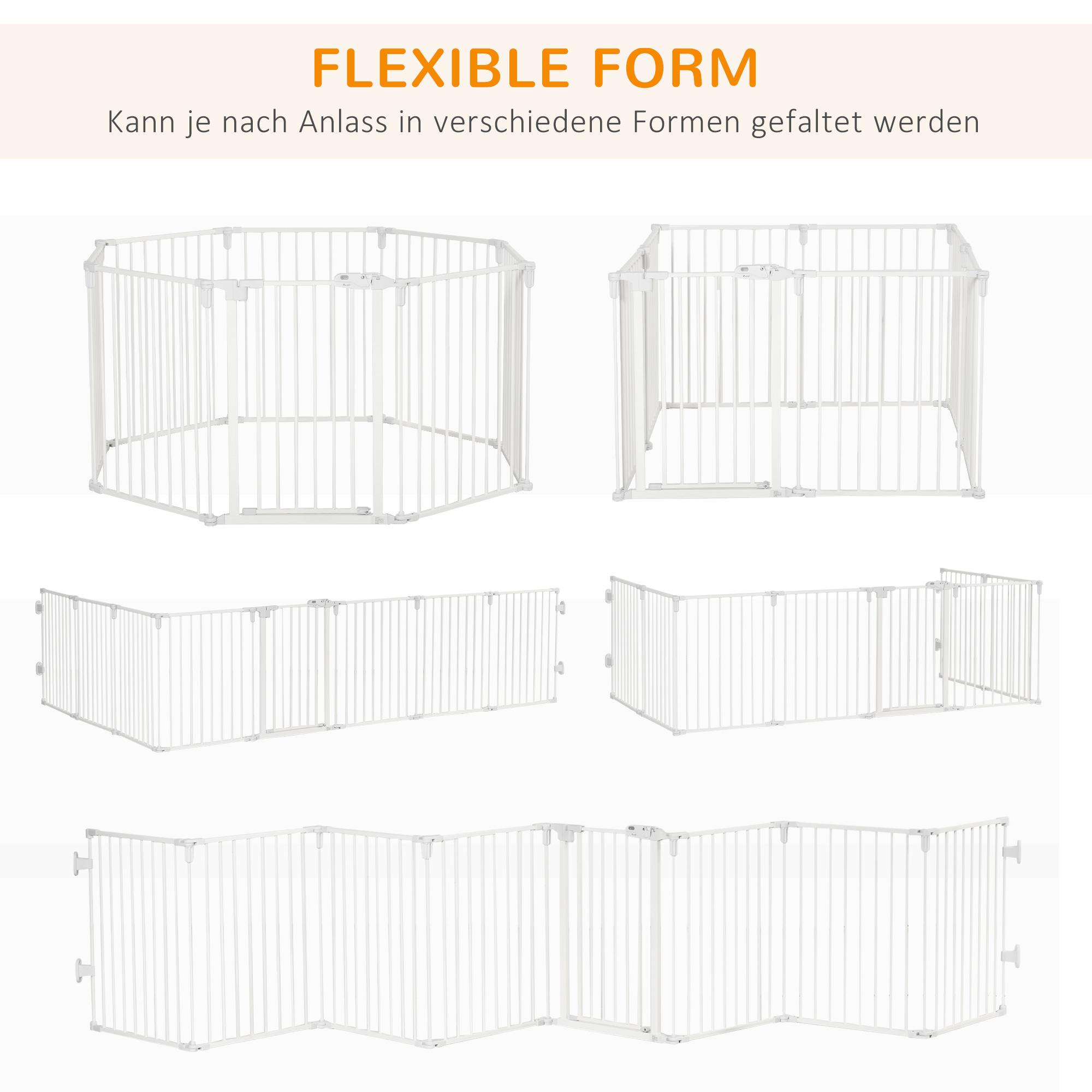 Dá sa použiť ako samostatná ohrádka pre domáce zvieratá (8 panelov) na zaistenie bezpečnosti vášho domáceho maznáčika v interiéri, ako bezpečnostná brána na schody, ako bezpečnostná zábrana na ohradenie sporáka alebo vianočného stromčeka alebo ako bariéra na rozdelenie priestoru. Flexibilný tvar a pribalené upevnenie na stenu vám umožňuje prispôsobiť si dizajn.