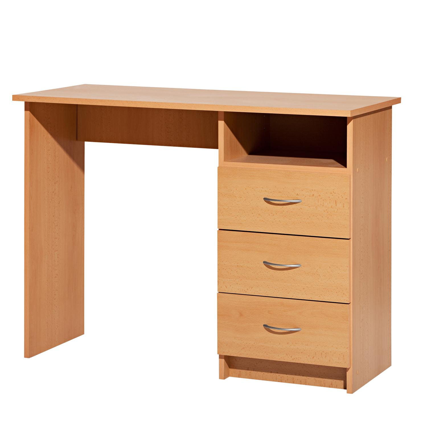 Písací stôl 44 vo farebnom prevedení buk je dobrou voľbou, nielen pokiaľ zháňate prvý písací stôl pre vaše deti. Písací stôl obsahuje tri zásuvky a jednu otvorenú policu s montážou možnou iba na pravú stranu. Jednoduchý písací stôl využijete v každej miestnosti zariadenej nábytkom v prevedení buk, napríklad vo vašej pracovni či spálni.