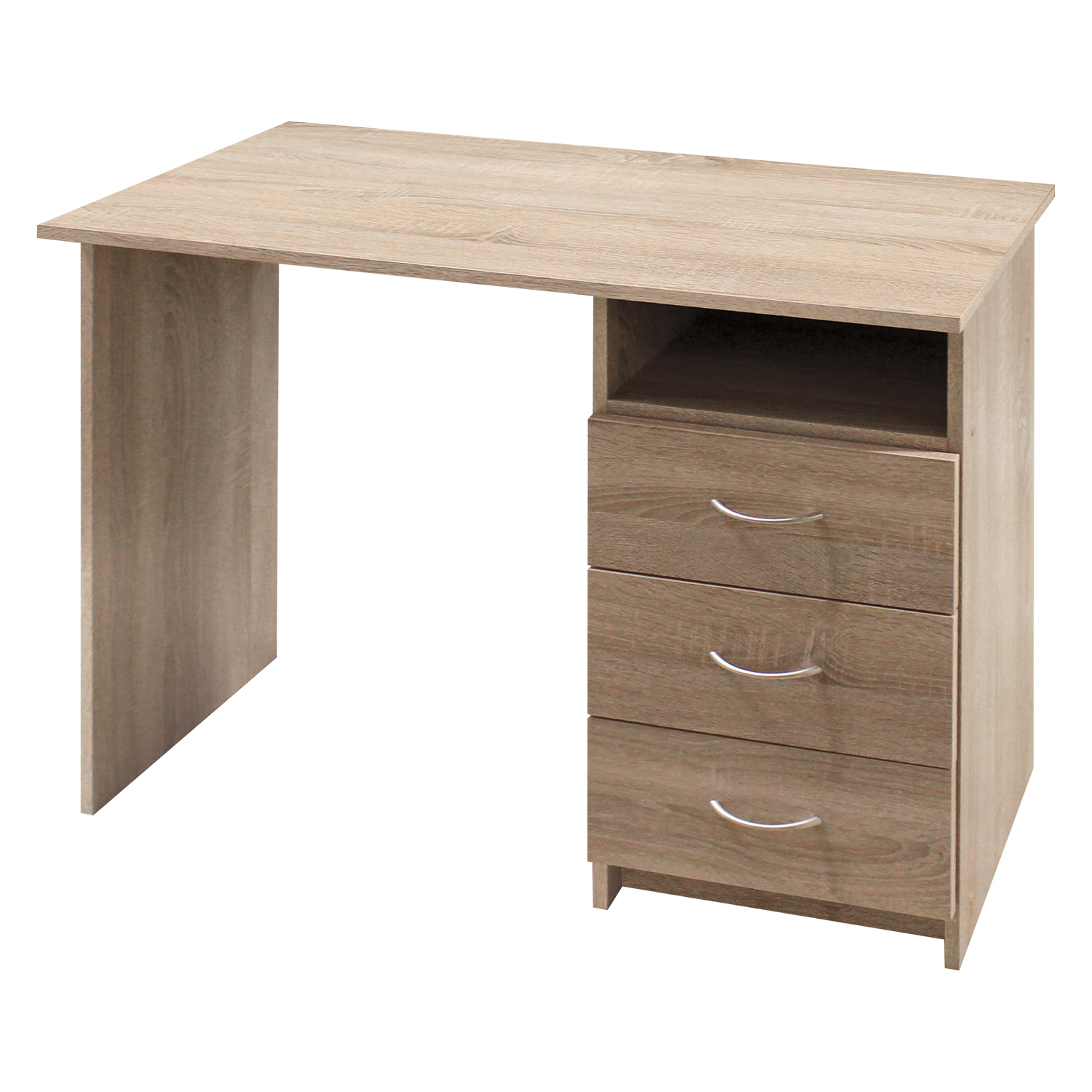 Písací stôl 50044 vo farebnom prevedení dub Sonoma sa bude hodit do každej študentskej izby či pracovne zariadenej práve nábytkom v prevedení dub Sonoma. Písací stôl obsahuje tri zásuvky s montážou možnou iba na pravú stranu. Do zásuviek tak uložíte všetky potrebné dokumenty, zošity, knihy a kancelárske potreby. Nad zásuvkami sa nachádza odkladací priestor na rozrobenú prácu. Na dosku stola sa vojde ako notebook, tak zošity a učebnice. Učenie tak bude pri tomto peknom stole veľmi príjemné, stačí zvoliť ľubovoľnú stoličku. Jednoduchý stôl poteší ako prváčikov, tak vyskokoškolských študentov, umiestnite tento stôl do ich izby a nechajte deti v pokoji študovať a baviť sa, moderný stôl im bude dobrým spoločníkom.