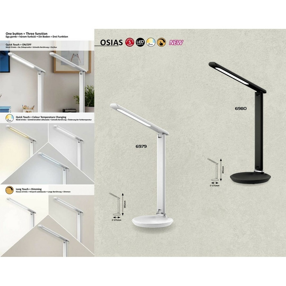 Stolné svietidlo Osias v čiernej farbe bude skvelým doplnkom vašej modernej pracovne alebo pracovného stola v ktorejkoľvek inej miestnosti v domácnosti, kde obvykle čítate, študujete, alebo pracujete na svojom notebooku.Osias má vstavaný LED svetelný zdroj s výkonom 9 W a svetelným tokom 400 lúmenov. Farebnú teplotu svietidla je možné nastaviť v rozmedzí 2700 až 6500 K, tzn. môžete nastaviť teplé, prirodzené alebo studené biele svetlo podľa vašich aktuálnych potrieb. Tento model je navyše možné pomocou vypínača stlmiť v troch krokoch, tzn. zvoliť možno aj jeho jas.Rozmery stolného svietidla Osias vyrobeného z plastu sú: priemer dekoračného podstavca je 171 mm, výška svietidla 391 mm a vzdialenosť od jej stonky 171 mm.