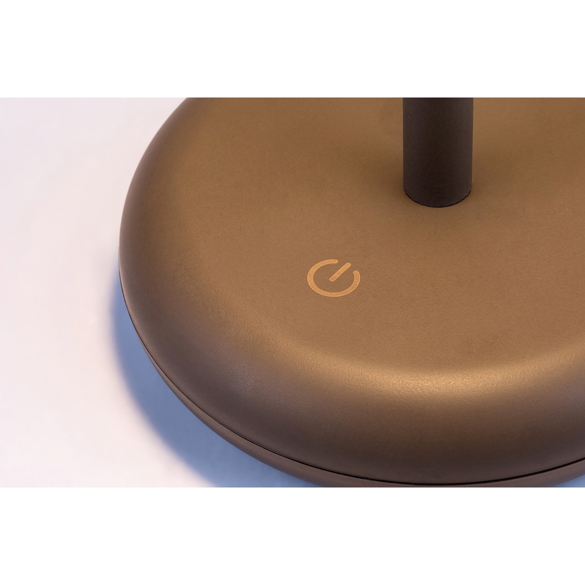 Vonkajšia dekoratívna lampa Konin v modernom štýle je vďaka svojmu príjemnému a útulnému vzhľadu skvelou voľbou na terasu alebo do záhrady. Model karamelovej farby je vyrobený z kovu s priehľadným plastovým tienidlom a je doplnený okrúhlou ozdobnou základňou rovnakej veľkosti ako hlava lampy.Lampa má zabudovaný LED svetelný zdroj s výkonom 6 W, svietivosťou 60 lúmenov s tienidlom a 160 lúmenov bez tienidla a životnosťou 25 000 hodín. Svetelný zdroj s farebnou teplotou 3000 K vyžaruje teplé biele svetlo. Svietidlo je možné stmievať pomocou dotykového spínača, tj meniť jeho jas. Má tiež dotykový spínač s nastaviteľnou pamäťovou funkciou a je možné ho nabíjať pomocou USB kábla. Čas nabíjania je 4 hodiny a prevádzková doba je 5 – 6 hodín. Batéria má napätie 3,7 V a kapacitu 1800 mAh.Konin má výšku 260 mm, priemer 110 mm a montážny priemer 110 mm. Lampa má krytie IP44, ktoré zaručuje ochranu proti vniknutiu pevných predmetov väčších ako 1 mm a proti striekajúcej vode z akéhokoľvek smeru. Ideálny rozsah pracovných teplôt je -10 – 45 °C.