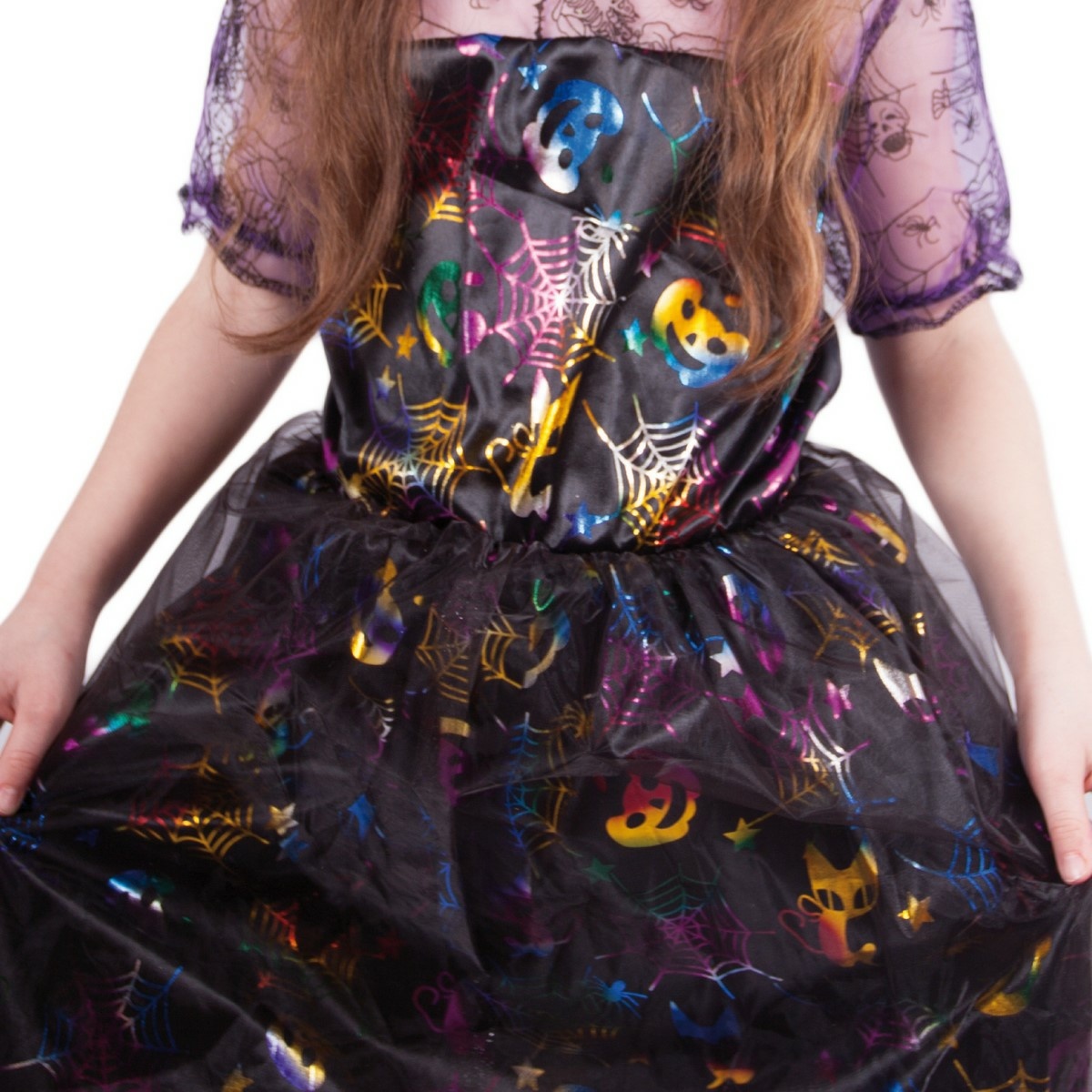 Karnevalový kostým pre malé čarodejnice. Kostým čierno-fialovej farby vo veľkosti M je určený pre dievčatká vo vekovom rozmedzí 6-8 rokov. Šaty sú dekorované farebnými halloweenskymi motívmi.