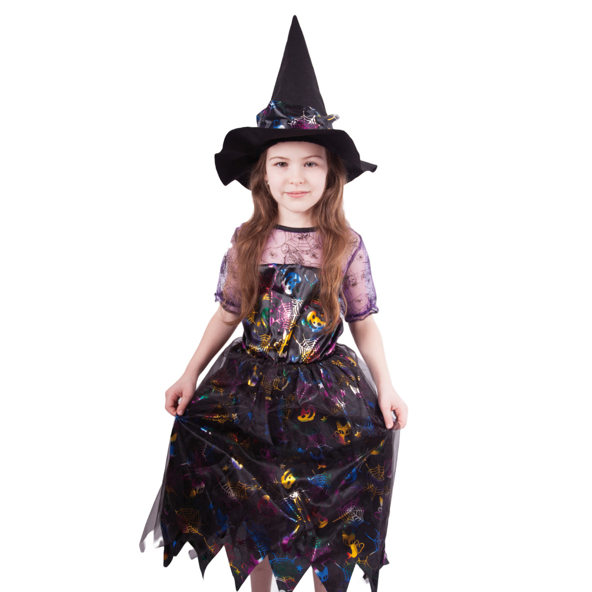 Karnevalový kostým pre malé čarodejnice! Kostým čierno-fialovej farby vo veľkosti S je určený pre dievčatká vo vekovom rozmedzí 4 – 6 rokov. Šaty sú dekorované farebnými halloweenskymi motívmi. Súčasťou kostýmu je perfektne zladený čarodejnícky klobúk. S týmto úchvatným kostýmom sa zaručene staneš hviezdou karnevalu aj Halloweenu!