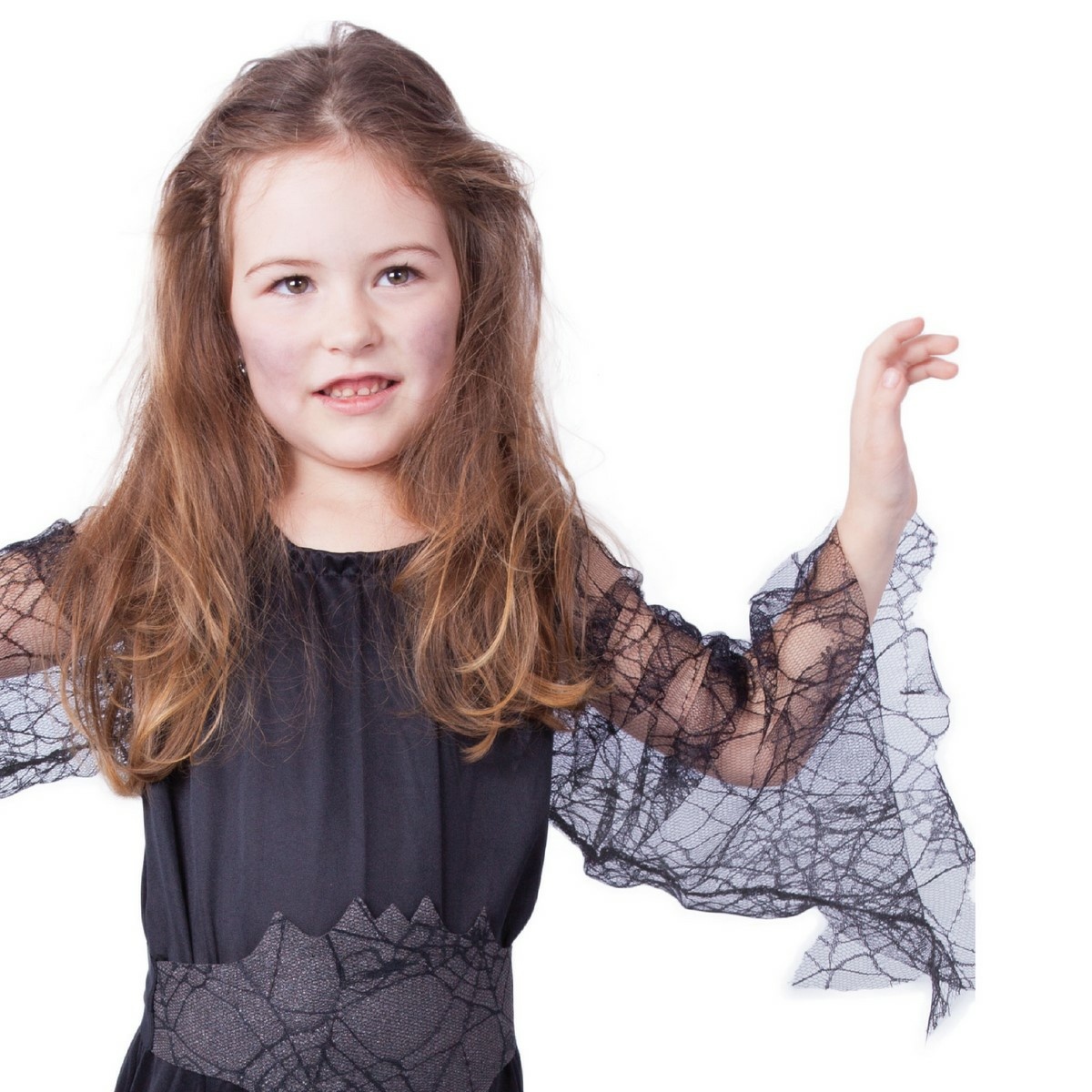 Nádherný kostým pre malé čarodejnice. Kostým čiernej farby vo veľkosti M je určený pre dievčatká vo vekovom rozmedzí 6-8 rokov (116-128 cm). Šaty sú dekorované priehľadnými rukávmi s motívom pavučín. S týmto úchvatným kostýmom budeš vyzerať ako pravá čarodejnica! Skvele sa hodí aj na oslavu Halloweenu!