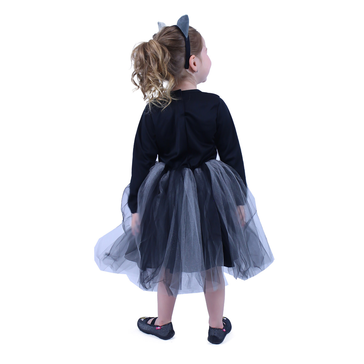 Roztomilý karnevalový kostým s motívom mačky! Kostým v čierno-sivej farbe s ružovými kamienkami vo veľkosti S je určený pre dievčatká vo vekovom rozmedzí 4 – 6 rokov (110 – 116 cm). Balenie obsahuje šaty a čelenku s uškami.