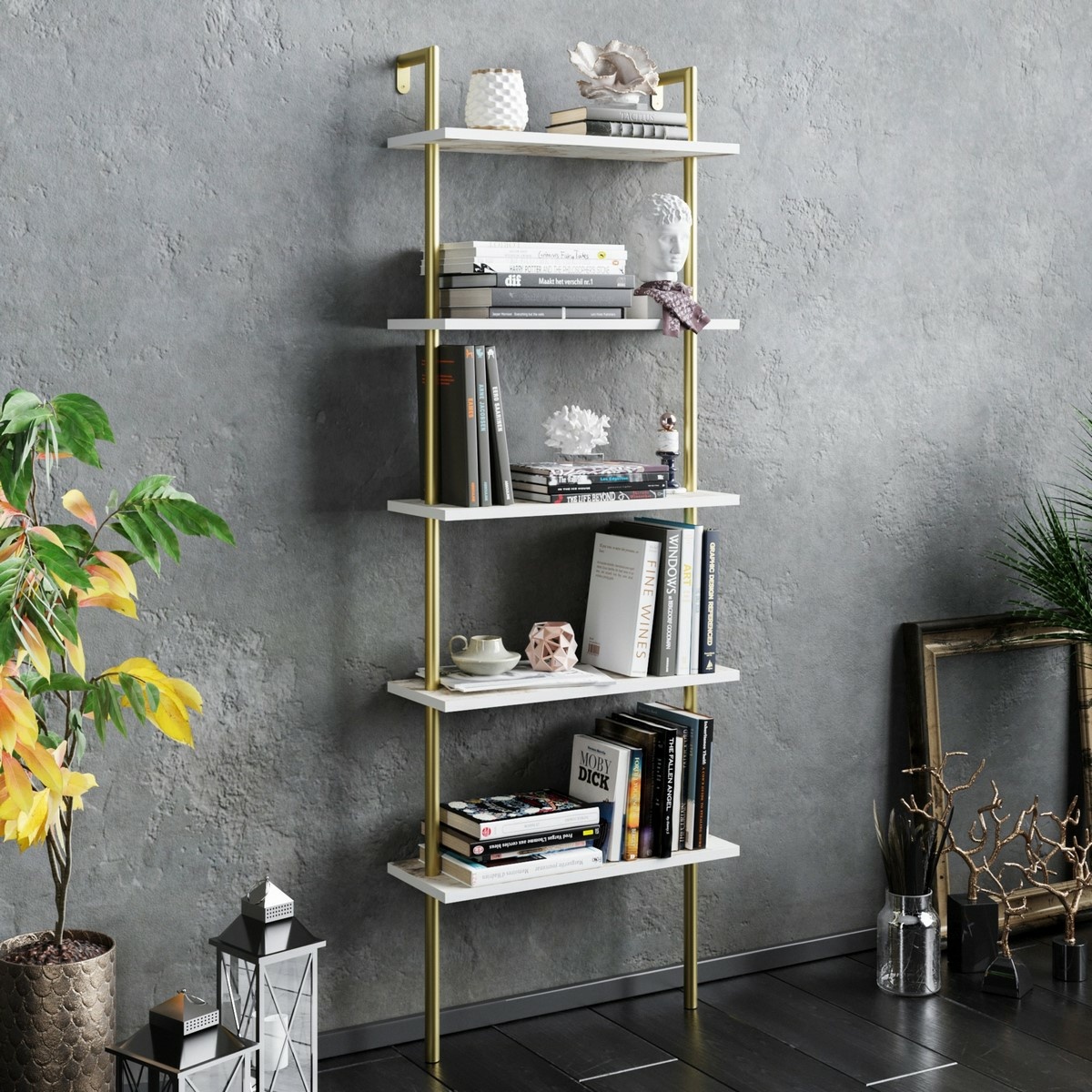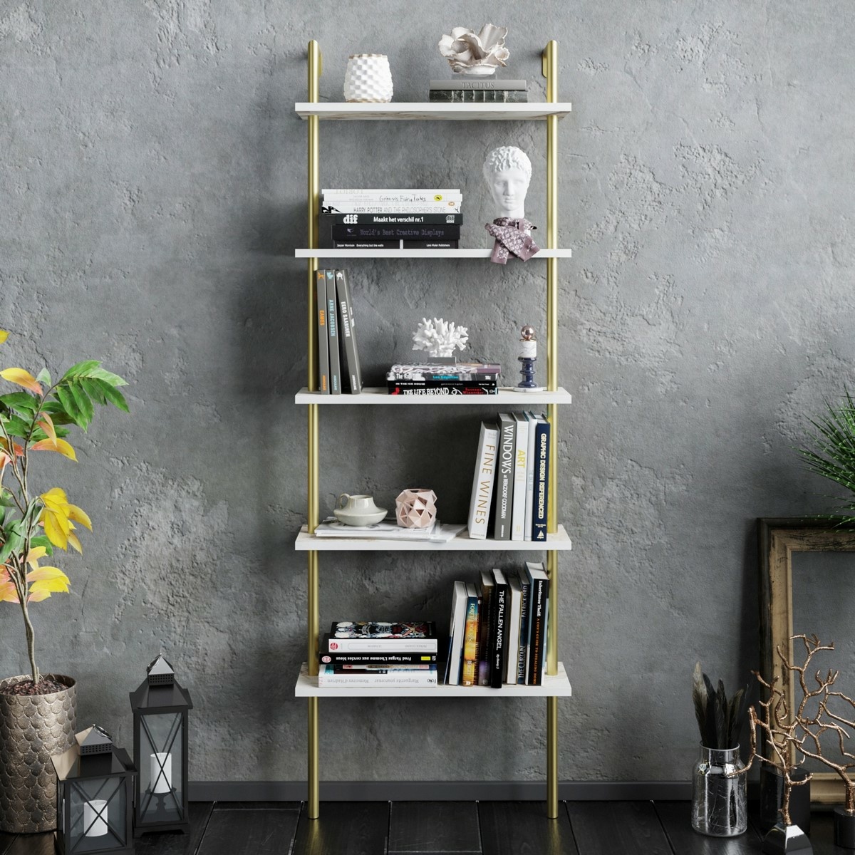 S viacerými policami s výškou 30 cm ponúka knižnica dostatok priestoru na knihy, časopisy a dekoratívne predmety. Otvorený dizajn umožňuje prehľadnú organizáciu a ľahký prístup k uloženým predmetom, zatiaľ čo čisté línie a lesklé zlaté akcenty dodávajú celej kompozícii rafinovaný vzhľad. Praktické rozmery zabezpečujú, že sa ľahko zmestí do menších miestností, kde vytvára štýlový a funkčný úložný prvok.