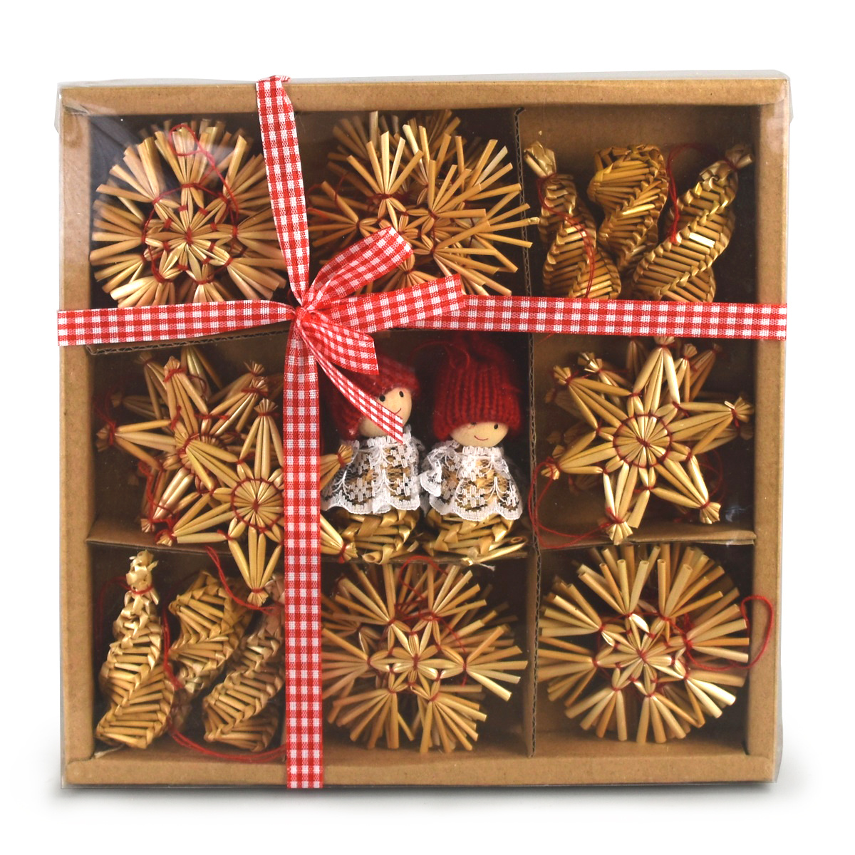 Sada tradične vyrábaných slamených ozdôb vám pomôže k štýlovej vianočnej výzdobe interiéru. Ozdoby vyniknú na vianočnom stromčeku aj na iných prízdobách. Sada obsahuje 38 ks ozdôb rôznych tvarov, vrátane 2 ks roztomilých bábik. Veľkosť jednej ozdoby je cca 6 cm.