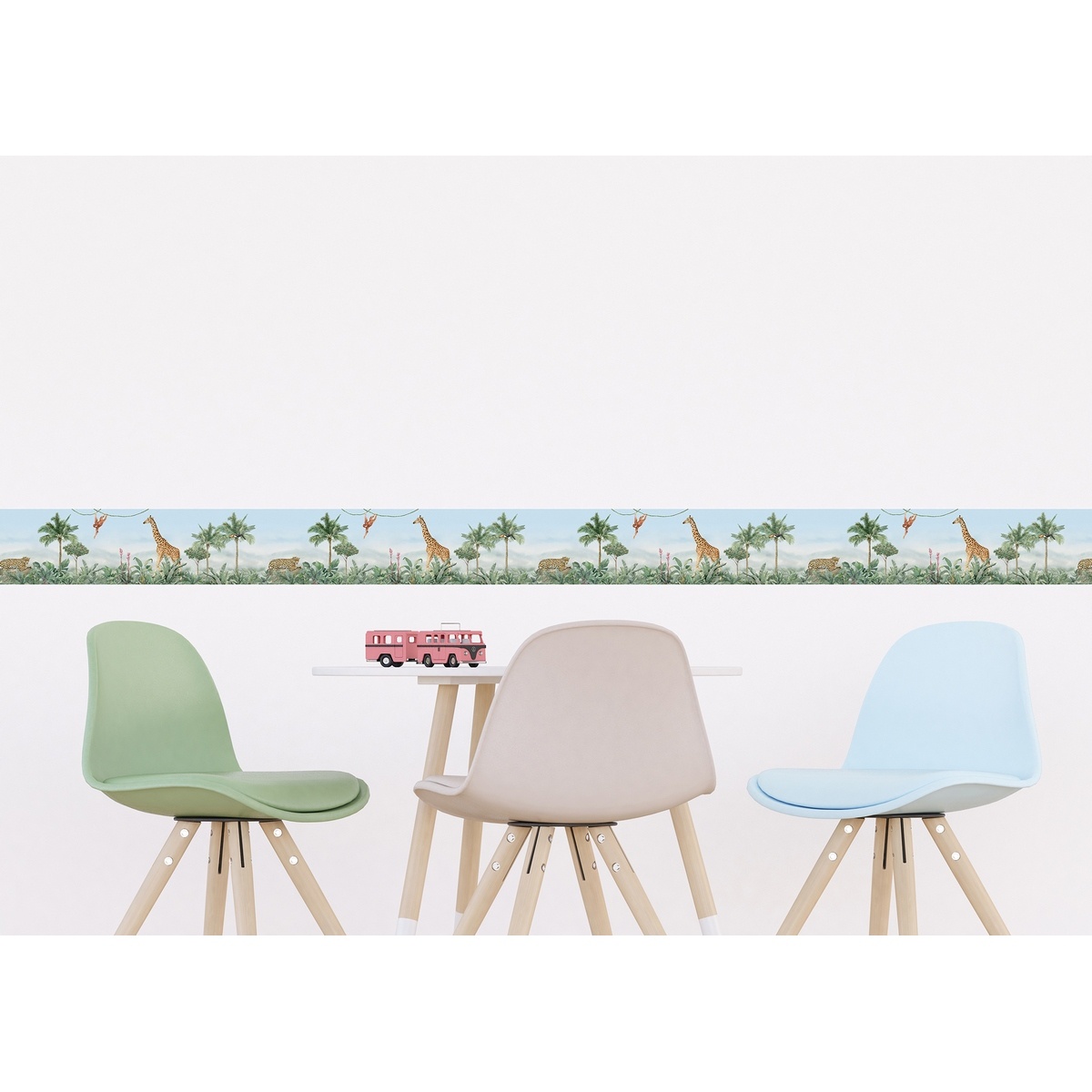 Krásna bordúra sa bude skvele vynímať v izbe všetkých dievčat a chlapcov. Každé dieťa bude mať radosť, ak mu ozdobíte izbu bordúrou s obrázkami džungle. Môžete ju použiť samostatne alebo v kombinácii s fototapetami či dekoráciami.Veľmi ľahko sa nanáša. Na čistý a hladký povrch nakreslíte vodorovnú čiaru a aplikujete bordúru. Pred konečným pritlačením sa uistite, že je bordúra umiestnená správne. Na uľahčenie nalepenia je možné bordúru mierne zahriať fénom. Aplikáciu je nutné vykonať priamo na stenu a nie na potapetovaný povrch. Ak potrebujete bordúru odstrániť, stačí za ňu len ľahko zatiahnuť. Materiál: samolepiaca PVC fólia.Produkt je vyrobený v EÚ. Tento produkt je určený výhradne na dekoračné účely a môže byť aplikovaný iba dospelými osobami alebo pod dohľadom dospelej osoby. Uchovávajte mimo dosahu detí mladších ako 3 roky z dôvodu nebezpečenstva udusenia.