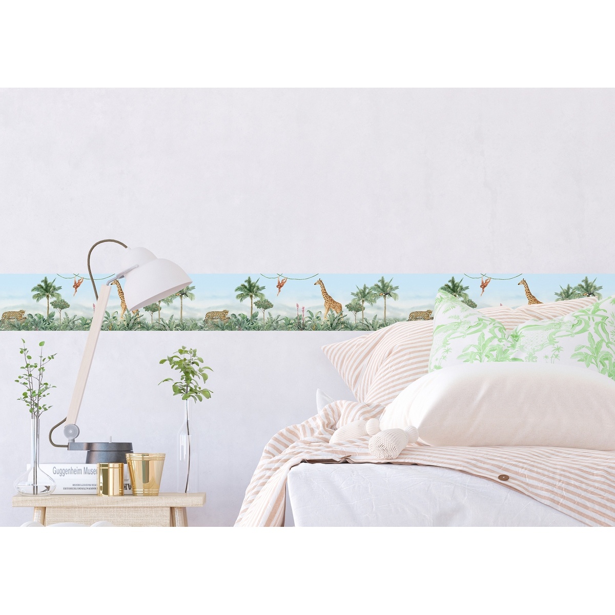Krásna bordúra sa bude skvele vynímať v izbe všetkých dievčat a chlapcov. Každé dieťa bude mať radosť, ak mu ozdobíte izbičku bordúrou s obrázkami džungle. Môžete ju použiť samostatne alebo v kombinácii s fototapetami či dekoráciami.Veľmi ľahko sa nanáša. Na čistý a hladký povrch nakreslíte vodorovnú čiaru a aplikujete bordúru. Pred konečným pritlačením sa uistite, že je bordúra umiestnená správne. Na uľahčenie nalepenia je možné bordúru mierne zahriať fénom. Aplikáciu je nutné vykonať priamo na stenu a nie na potapetovaný povrch. Ak potrebujete bordúru odstrániť, stačí za ňu len ľahko zatiahnuť. Materiál: samolepiaca PVC fólia.Produkt je vyrobený v EÚ. Tento produkt je určený výhradne na dekoračné účely a môže byť aplikovaný iba dospelými osobami alebo pod dohľadom dospelej osoby. Uchovávajte mimo dosahu detí mladších ako 3 roky z dôvodu nebezpečenstva udusenia.