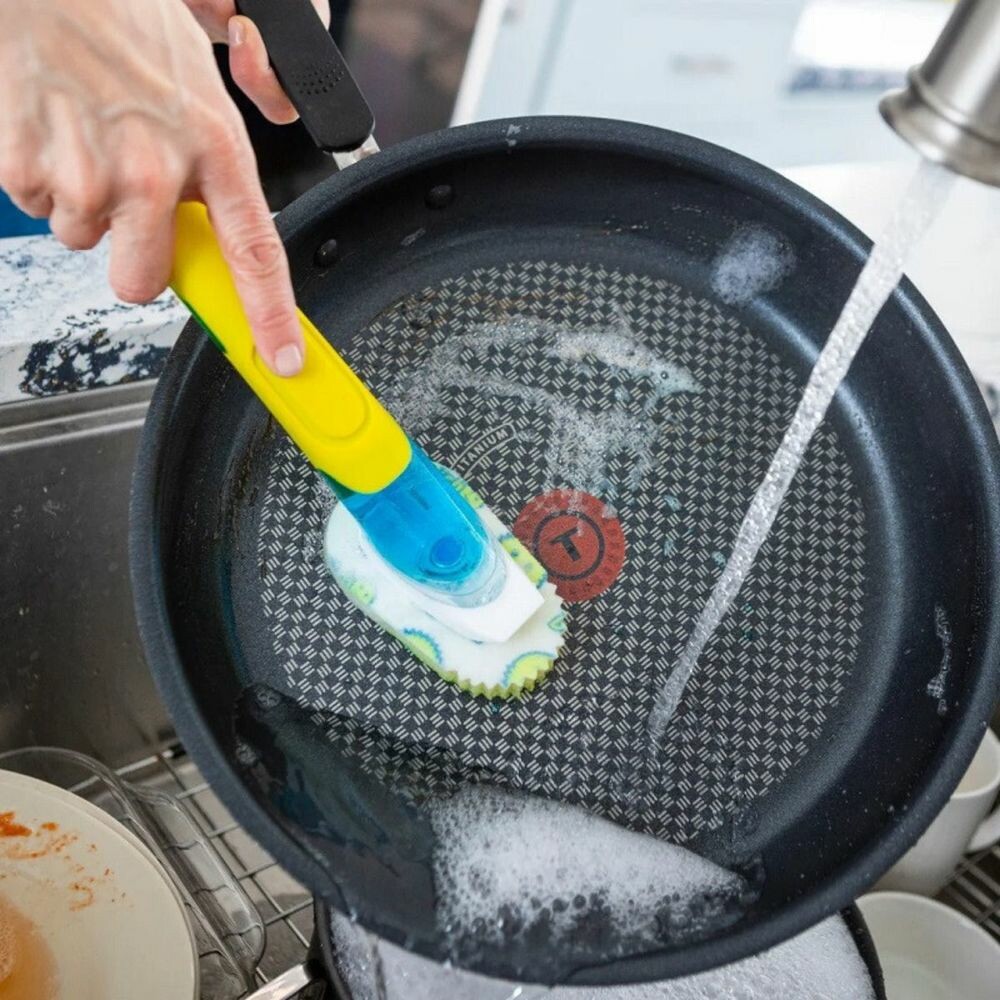 Hubka je vybavená zásobníkom na saponát, ktorý sa jednoducho dopĺňa a prostriedok sa dávkuje priamo na povrch hubky pri umývaní. Vďaka tomu máte vždy správne množstvo prípravku tam, kde ho potrebujete, bez zbytočného plytvania.