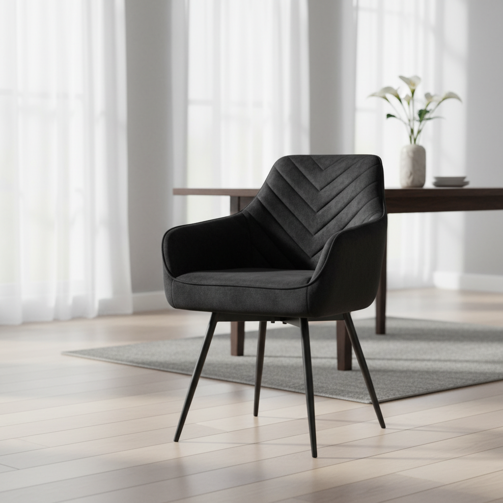 Skvelá jedálenská stolička SERVIO VELVET vyčarí kúsok elegancie vo vašej jedálni alebo pracovni. Vďaka prešívanému operadlu a pohodlným podrúčkam budete mať zaručené dokonalé sedenie a relax. Sedenie je extrémne pohodlné vďaka taštičkovým pružinám v sedáku. Veľkou výhodou je aj funkcia Auto-return, čo je sedadlo otočné o 180 stupňov, s funkciou návratu do pôvodnej polohy. Nohy stoličky sú kovové, v elegantnej čiernej farbe. Výborne sa hodí do každého moderného interiéru.