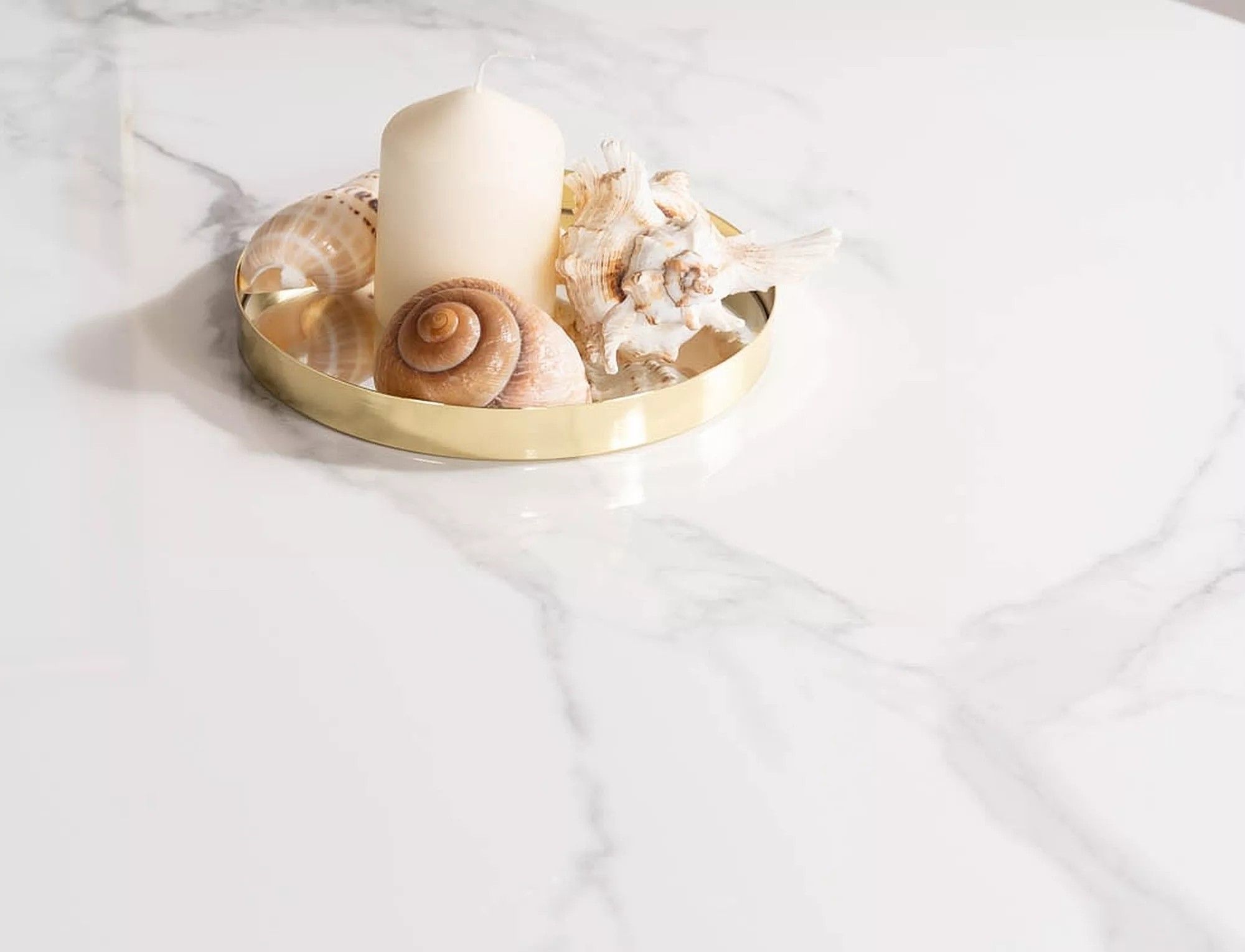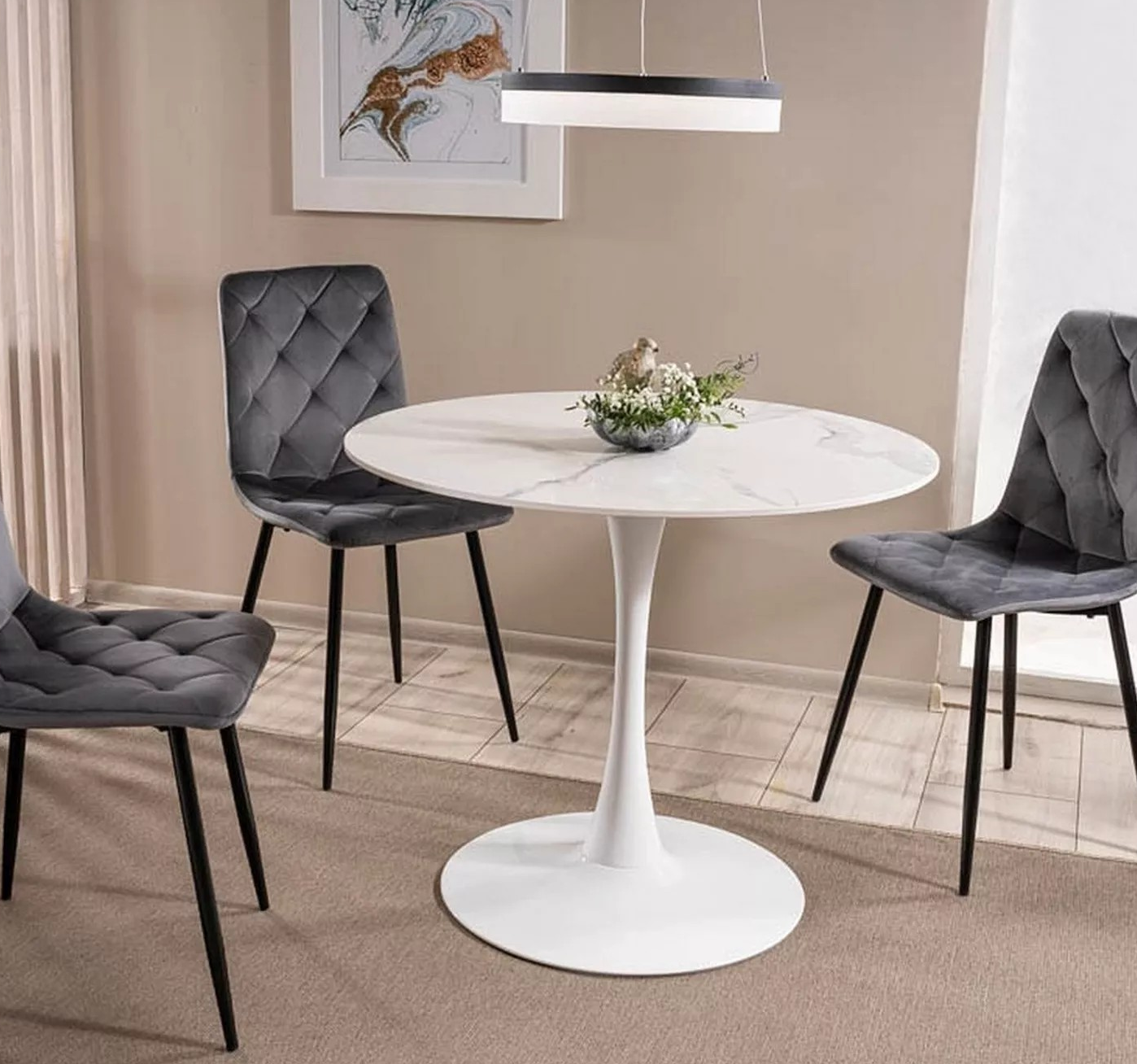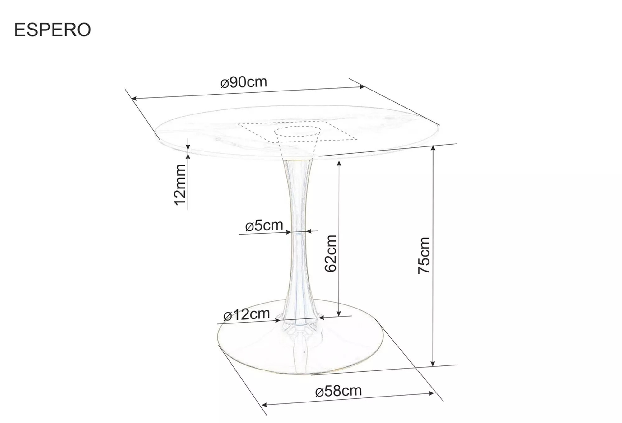Moderný jedálenský stôl ESPERO okrúhly s efektom mramoru čo prinesie do vašej jedálne nielen elegantný dizajn, ale aj praktickosť a trvanlivosť. Noha stola ESPERO je nadčasová v prevedení biela a zlatá. Jedálenský stôl je dodávaný v demonte.